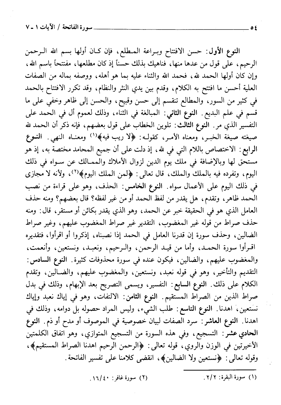 التَّقْدِيمُ وَالتَّأْخِيرُ، وَهُوَ فِي قَوْلِهِ نَعْبُدُ، وَنَسْتَعِينُ، وَالْمَغْضُوبُ عَلَيْهِمْ، وَالضَّالِّينَ، وَتَقَدَّمَ الْكَلَامُ عَلَى ذَلِكَ. النَّوْعُ السَّابِعُ: التَّفْسِيرُ، وَيُسَمَّى التَّصْرِيحُ بَعْدَ الْإِبْهَامِ، وَذَلِكَ فِي بَدَلِ صِرَاطَ الَّذِينَ مِنَ الصِّرَاطَ الْمُسْتَقِيمَ. النَّوْعُ الثَّامِنُ: الِالْتِفَاتُ، وَهُوَ فِي إِيَّاكَ نَعْبُدُ وَإِيَّاكَ نَسْتَعِينُ، اهْدِنَا. النَّوْعُ التَّاسِعُ: طَلَبُ الشَّيْءِ، وَلَيْسَ الْمُرَادُ حُصُولَهُ بَلْ دَوَامَهُ، وَذَلِكَ فِي اهْدِنَا. النَّوْعُ الْعَاشِرُ: سَرْدُ الصِّفَاتِ لِبَيَانِ خُصُوصِيَّةٍ فِي الْمَوْصُوفِ أَوْ مَدْحٍ أَوْ ذَمٍّ. النَّوْعُ الْحَادِي عَشَرَ: التَّسْجِيعُ، وَفِي هَذِهِ السُّورَةِ مِنَ التَّسْجِيعِ الْمُتَوَازِي، وَهُوَ اتِّفَاقُ الْكَلِمَتَيْنِ الْأَخِيرَتَيْنِ فِي الْوَزْنِ وَالرَّوِيِّ، قَوْلُهُ تَعَالَى: الرَّحْمنِ الرَّحِيمِ ... اهْدِنَا الصِّراطَ الْمُسْتَقِيمَ، وَقَوْلُهُ تَعَالَى: نَسْتَعِينُ وَلَا الضَّالِّينَ، انْقَضَى كَلَامُنَا عَلَى تفسير الفاتحة.