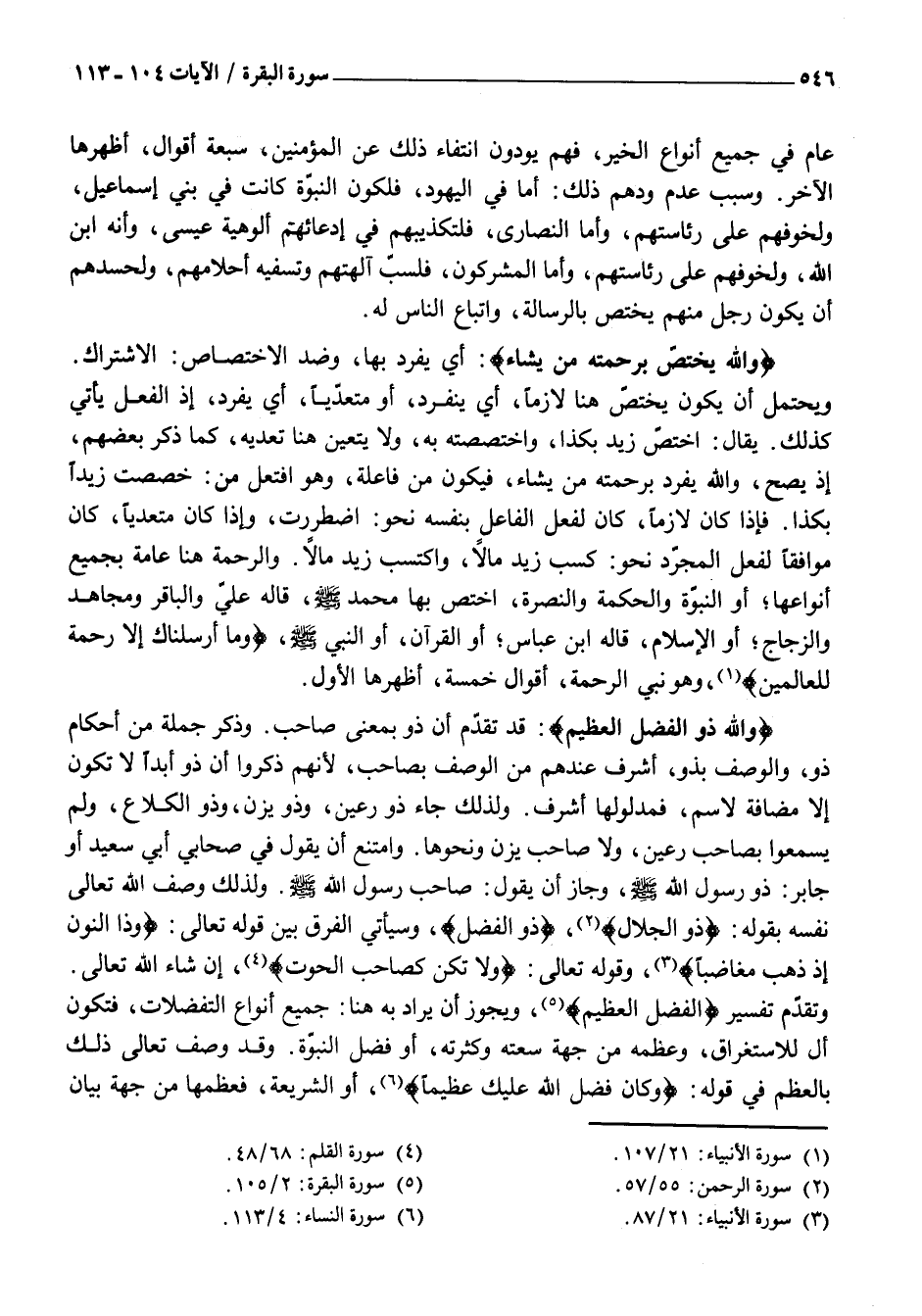 وَيُحْتَمَلُ أَنْ يَكُونَ يَخْتَصُّ هُنَا لَازِمًا، أَيْ يَنْفَرِدُ، أَوْ مُتَعَدِّيًا، أَيْ يُفْرِدُ، إِذِ الْفِعْلُ يَأْتِي كَذَلِكَ. يُقَالُ: اختصّ زيد بِكَذَا، وَاخْتَصَصْتُهُ بِهِ، وَلَا يَتَعَيَّنُ هُنَا تَعَدِّيهِ، كَمَا ذَكَرَ بَعْضُهُمْ، إِذْ يَصِحُّ، وَاللَّهُ يُفْرِدُ بِرَحْمَتِهِ مَنْ يَشَاءُ، فَيَكُونُ مَنْ فَاعِلَةً، وَهُوَ افْتَعَلَ مِنْ: خَصَصْتُ زَيْدًا بِكَذَا. فَإِذَا كَانَ لَازِمًا، كَانَ لِفِعْلِ الْفَاعِلِ بِنَفْسِهِ نَحْوُ: اضْطُرِرْتُ، وَإِذَا كَانَ مُتَعَدِّيًا، كَانَ مُوَافِقًا لِفِعْلِ الْمُجَرَّدِ نَحْوُ: كَسَبَ زَيْدٌ مَالًا، وَاكْتَسَبَ زَيْدٌ مَالًا. وَالرَّحْمَةُ هُنَا عَامَّةٌ بِجَمِيعِ أَنْوَاعِهَا أَوِ
