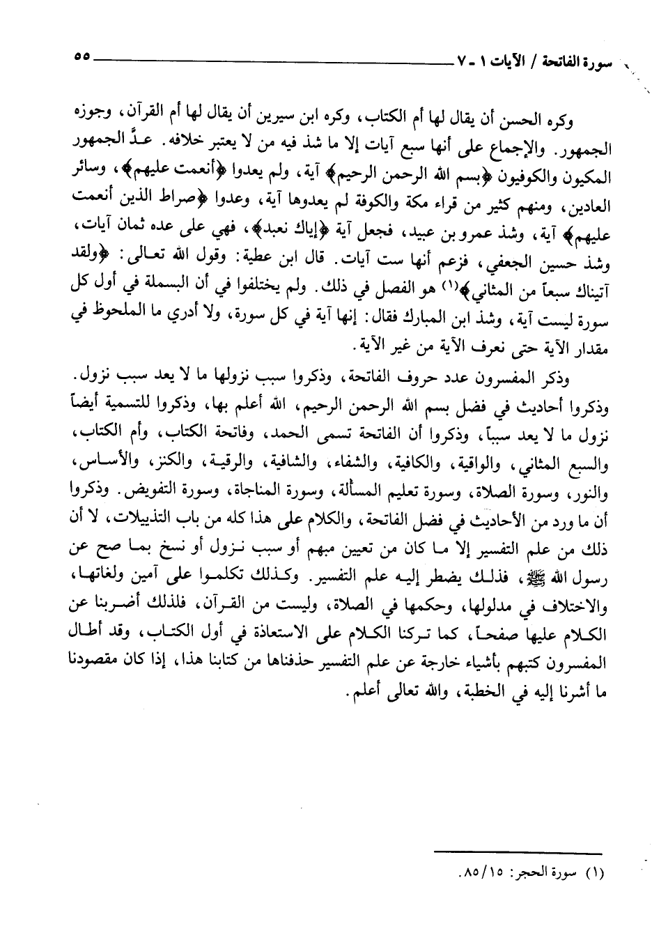 وَكَرِهَ الْحَسَنُ أَنْ يُقَالَ لَهَا أُمُّ الْكِتَابِ، وَكَرِهَ ابْنُ سِيرِينَ أَنْ يُقَالَ لَهَا أُمُّ الْقُرْآنِ، وَجَوَّزَهُ الْجُمْهُورُ. وَالْإِجْمَاعُ عَلَى أَنَّهَا سَبْعُ آيَاتٍ إِلَّا مَا شَذَّ فِيهِ مَنْ لَا يَعْتَبِرُ خِلَافَهُ. عَدَّ الْجُمْهُورُ الْمَكِّيُّونَ وَالْكُوفِيُّونَ بِسْمِ اللَّهِ الرَّحْمنِ الرَّحِيمِ آيَةً، وَلَمْ يَعُدُّوا أَنْعَمْتَ عَلَيْهِمْ، وَسَائِرُ العادين، ومنهم كَثِيرٍ مِنْ قُرَّاءِ مَكَّةَ وَالْكُوفَةِ لَمْ يَعُدُّوهَا آيَةً، وَعَدُّوا صِراطَ الَّذِينَ أَنْعَمْتَ عَلَيْهِمْ آيَةً، وَشَذَّ عَمْرُو بْنُ عُبَيْدٍ، فَجَعَلَ آيَةً إِيَّاكَ نَعْبُدُ، فَهِيَ عَلَى عَدِّهِ ثَمَانِ آيَاتٍ، وَشَذَّ حُسَيْنٌ الْجُعْفِيُّ، فَزَعَمَ أَنَّهَا سِتُّ آيَاتٍ. قَالَ ابْنُ عَطِيَّةَ: وَقَوْلُ اللَّهِ تَعَالَى: وَلَقَدْ آتَيْناكَ سَبْعاً مِنَ الْمَثانِي «1»
