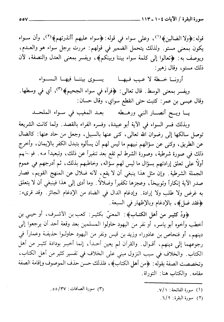 قَوْلِهِ: وَلَا الضَّالِّينَ «1» ، وَعَلَى سَوَاءَ فِي قَوْلِهِ: سَواءٌ عَلَيْهِمْ أَأَنْذَرْتَهُمْ «2» ، وَأَنَّ سَوَاءٌ يَكُونُ بِمَعْنَى مُسْتَوٍ. وَلِذَلِكَ يَتَحَمَّلُ الضَّمِيرَ فِي قَوْلِهِمْ: مَرَرْتُ بِرَجُلٍ سَوَاءٍ هُوَ وَالْعَدَمُ، وَيُوصَفُ بِهِ: تَعالَوْا إِلى كَلِمَةٍ سَواءٍ بَيْنَنا وَبَيْنَكُمْ، وَيُفَسَّرُ بِمَعْنَى الْعَدْلِ وَالنَّصَفَةِ، لِأَنَّ ذَلِكَ مُسْتَوٍ، وَقَالَ زُهَيْرٌ:
