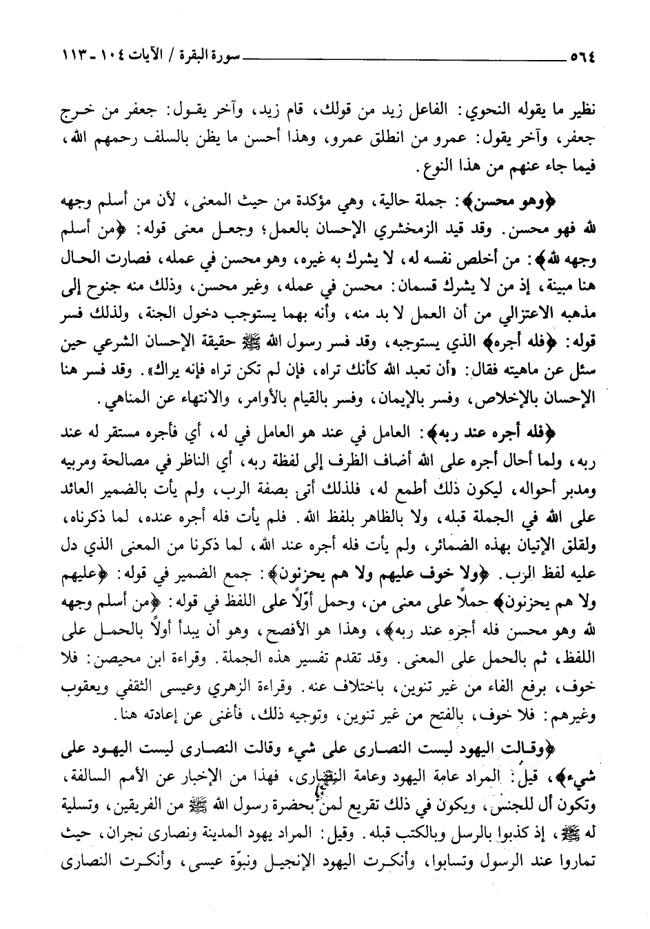 فَلَهُ أَجْرُهُ عِنْدَ رَبِّهِ: الْعَامِلُ فِي عِنْدَ هُوَ الْعَامِلُ فِي لَهُ، أَيْ فَأَجْرُهُ مُسْتَقِرٌّ لَهُ عِنْدَ رَبِّهِ، وَلَمَّا أَحَالَ أَجْرَهُ عَلَى اللَّهِ أَضَافَ الظَّرْفَ إِلَى لَفْظَةِ رَبِّهِ، أَيِ النَّاظِرِ فِي مَصَالِحِهِ وَمُرَبِّيهِ وَمُدَبِّرِ أَحْوَالِهِ، لِيَكُونَ ذَلِكَ أَطْمَعَ لَهُ، فَلِذَلِكَ أَتَى بِصِفَةِ الرَّبِّ، وَلَمْ يَأْتِ بِالضَّمِيرِ الْعَائِدِ عَلَى اللَّهِ فِي الْجُمْلَةِ قَبْلَهُ، وَلَا بِالظَّاهِرِ بِلَفْظِ اللَّهِ. فَلَمْ يَأْتِ فَلَهُ أَجْرُهُ عِنْدَهُ، لِمَا ذَكَرْنَاهُ، وَلِقَلَقِ الْإِتْيَانِ بِهَذِهِ الضَّمَائِرِ، وَلَمْ يَأْتِ فَلَهُ أَجْرُهُ عِنْدَ اللَّهِ، لِمَا ذَكَرْنَا مِنَ الْمَعْنَى الَّذِي دَلَّ عَلَيْهِ لَفْظُ الرَّبِّ. وَلا خَوْفٌ عَلَيْهِمْ وَلا هُمْ يَحْزَنُونَ: جُمِعَ الضَّمِيرُ فِي قَوْلِهِ: عَلَيْهِمْ وَلا هُمْ يَحْزَنُونَ حَمْلًا عَلَى مَعْنَى مَنْ، وَحُمِلَ أَوَّلًا عَلَى اللَّفْظِ فِي قَوْلِهِ: مَنْ أَسْلَمَ وَجْهَهُ لِلَّهِ وَهُوَ مُحْسِنٌ فَلَهُ أَجْرُهُ عِنْدَ رَبِّهِ، وَهَذَا هُوَ الْأَفْصَحُ، وَهُوَ أَنْ يُبْدَأَ أَوَّلًا بِالْحَمْلِ عَلَى اللَّفْظِ، ثُمَّ بِالْحَمْلِ عَلَى الْمَعْنَى. وَقَدْ تَقَدَّمَ تَفْسِيرُ هَذِهِ الْجُمْلَةِ. وَقِرَاءَةِ ابْنِ مُحَيْصِنٍ: فَلَا خَوْفُ، بِرَفْعِ الْفَاءِ مِنْ غَيْرِ تَنْوِينٍ، بِاخْتِلَافٍ عَنْهُ. وَقِرَاءَةِ الزهري وعيسى الثقفي ويعقوب وَغَيْرِهِمْ: فَلَا خَوْفَ، بِالْفَتْحِ مِنْ غَيْرِ تَنْوِينٍ، وَتَوْجِيهُ ذَلِكَ، فَأَغْنَى عَنْ إِعَادَتِهِ هُنَا.