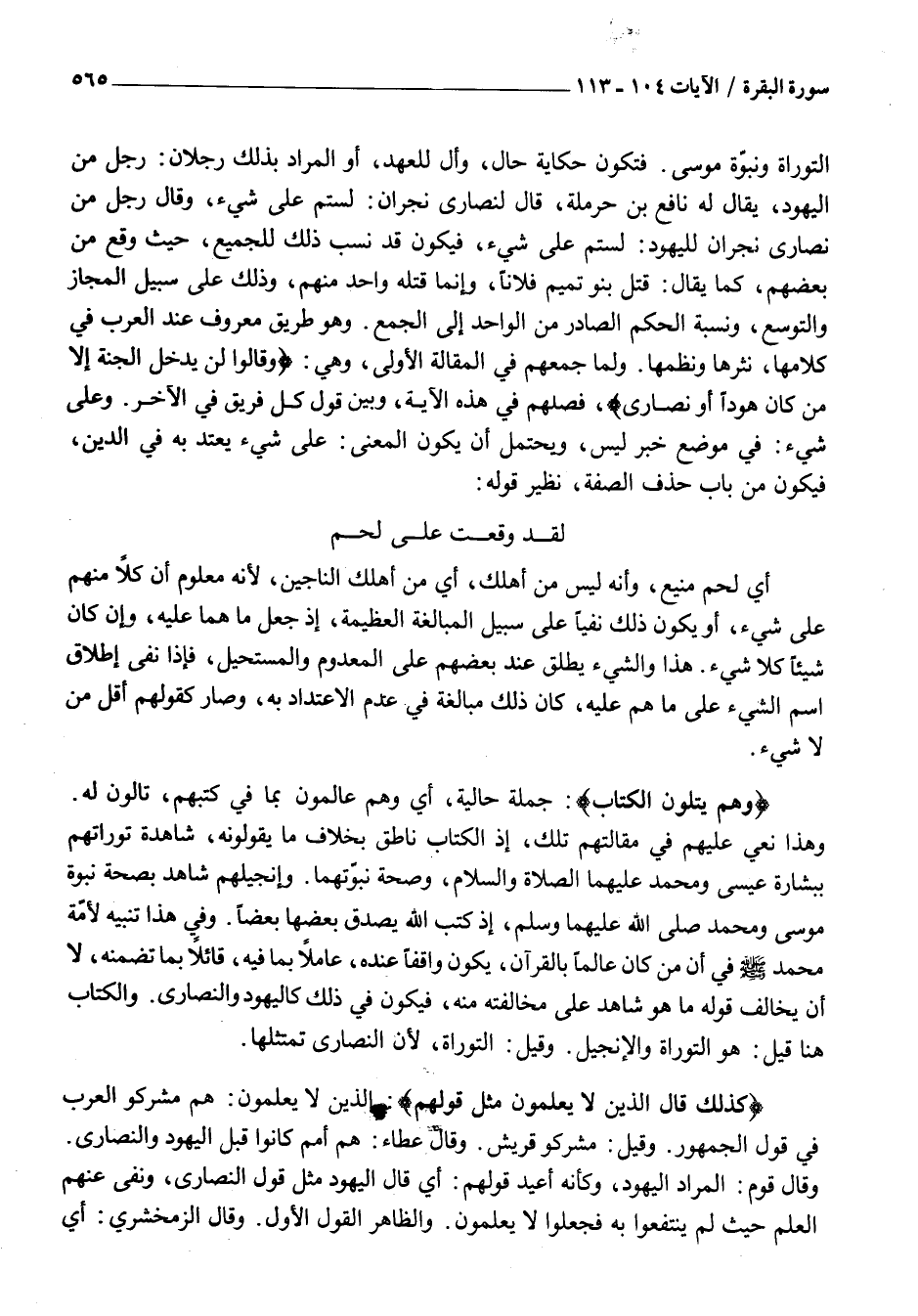 التَّوْرَاةَ وَنُبُوَّةَ مُوسَى. فَتَكُونُ حِكَايَةَ حَالٍ، وَأَلْ لِلْعَهْدِ، أَوِ الْمُرَادُ بِذَلِكَ رَجُلَانِ: رَجُلٌ مِنَ الْيَهُودِ، يُقَالُ لَهُ نَافِعُ بْنُ حَرْمَلَةَ، قَالَ لِنَصَارَى نَجْرَانَ: لَسْتُمْ عَلَى شَيْءٍ، وَقَالَ رَجُلٌ مِنْ نَصَارَى نَجْرَانَ لِلْيَهُودِ: لَسْتُمْ عَلَى شَيْءٍ، فَيَكُونُ قَدْ نُسِبَ ذَلِكَ لِلْجَمِيعِ، حَيْثُ وَقَعَ مِنْ بَعْضِهِمْ، كَمَا يُقَالُ: قَتَلَ بَنُو تَمِيمٍ فُلَانًا، وَإِنَّمَا قَتَلَهُ وَاحِدٌ مِنْهُمْ، وَذَلِكَ عَلَى سَبِيلِ الْمَجَازِ وَالتَّوَسُّعِ، وَنِسْبَةِ الْحُكْمِ الصَّادِرِ مِنَ الْوَاحِدِ إِلَى الْجَمْعِ. وَهُوَ طَرِيقٌ مَعْرُوفٌ عِنْدَ الْعَرَبِ فِي كَلَامِهَا، نَثْرِهَا وَنَظْمِهَا. وَلَمَّا جَمَعَهُمْ فِي الْمَقَالَةِ الْأُولَى، وَهِيَ: وَقالُوا لَنْ يَدْخُلَ الْجَنَّةَ إِلَّا مَنْ كانَ هُوداً أَوْ نَصارى، فَصَلَهُمْ فِي هَذِهِ الْآيَةِ، وَبَيَّنَ قَوْلَ كُلِّ فَرِيقٍ فِي الْآخَرِ. وَعَلَى شَيْءٍ: فِي مَوْضِعِ خَبَرِ لَيْسَ، وَيُحْتَمَلُ أَنْ يَكُونَ الْمَعْنَى: عَلَى شَيْءٍ يُعْتَدُّ بِهِ فِي الدِّينِ، فَيَكُونَ مِنْ بَابِ حَذْفِ الصِّفَةِ، نَظِيرُ قَوْلِهِ: