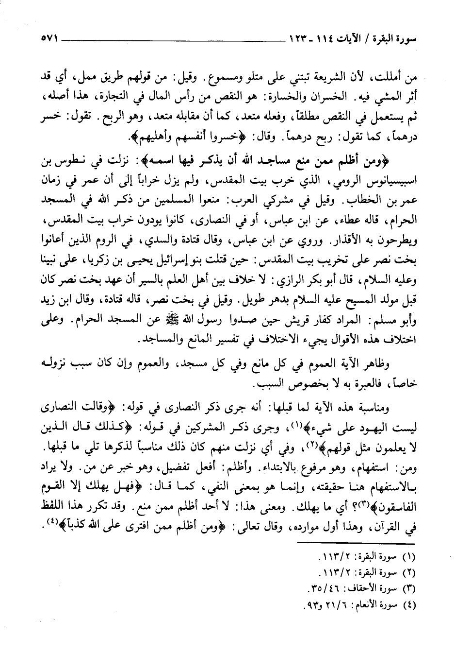 وَمَنْ أَظْلَمُ مِمَّنْ مَنَعَ مَساجِدَ اللَّهِ أَنْ يُذْكَرَ فِيهَا اسْمُهُ: نَزَلَتْ فِي نَطُّوسَ بْنِ اسْبِيسْيَانُوسَ الرُّومِيِّ، الَّذِي خَرَّبَ بَيْتَ الْمَقْدِسِ، وَلَمْ يَزَلْ خَرَابًا إِلَى أَنْ عُمِّرَ فِي زَمَانِ عُمَرَ بْنِ الْخَطَّابِ. وَقِيلَ فِي مُشْرِكِي الْعَرَبِ: مَنَعُوا الْمُسْلِمِينَ مِنْ ذِكْرِ اللَّهِ فِي الْمَسْجِدِ الْحَرَامِ، قَالَهُ عَطَاءٌ، عَنِ ابْنِ عَبَّاسٍ، أَوْ فِي النَّصَارَى، كَانُوا يَوَدُّونَ خَرَابَ بَيْتِ الْمَقْدِسِ، وَيَطْرَحُونَ بِهِ الْأَقْذَارَ. وَرُوِيَ عَنِ ابْنِ عَبَّاسٍ، وَقَالَ قَتَادَةُ وَالسُّدِّيُّ، فِي الرُّومِ الَّذِينَ أَعَانُوا بُخْتَ نَصَّرَ عَلَى تَخْرِيبِ بَيْتِ الْمَقْدِسِ: حِينَ قَتَلَتْ بَنُو إِسْرَائِيلَ يَحْيَى بْنَ زَكَرِيَّا، عَلَى نَبِيِّنَا وَعَلَيْهِ السَّلَامُ، قَالَ أَبُو بَكْرٍ الرَّازِيُّ: لَا خِلَافَ بَيْنَ أَهْلِ الْعِلْمِ بِالسِّيَرِ أَنَّ عَهْدَ بُخْتَ نَصَّرَ كَانَ قَبْلَ مَوْلِدِ الْمَسِيحِ عَلَيْهِ السَّلَامُ بِدَهْرٍ طَوِيلٍ. وَقِيلَ فِي بُخْتَ نَصَّرَ، قَالَهُ قَتَادَةُ، وَقَالَ ابْنُ زَيْدٍ وَأَبُو مُسْلِمٍ: الْمُرَادُ كُفَّارُ قُرَيْشٍ حِينَ صَدُّوا رَسُولَ اللَّهِ صَلَّى الله عَلَيْهِ وَسَلَّمَ عَنِ الْمَسْجِدِ الْحَرَامِ. وَعَلَى اخْتِلَافِ هَذِهِ الْأَقْوَالِ يَجِيءُ الِاخْتِلَافُ فِي تَفْسِيرِ الْمَانِعِ وَالْمَسَاجِدِ.