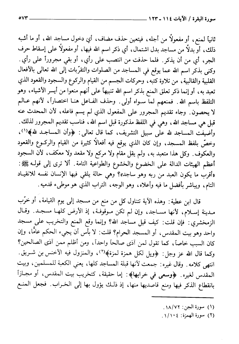انْتَهَى كَلَامُهُ. وَقَالَ غَيْرُهُ: جُمِعَتْ لِأَنَّهَا قِبْلَةُ الْمَسَاجِدِ كُلِّهَا، يَعْنِي الْكَعْبَةَ لِلْمُسْلِمِينَ، وَبَيْتَ الْمَقْدِسِ لِغَيْرِهِ. وَسَعى فِي خَرابِها: إِمَّا حَقِيقَةً، كَتَخْرِيبِ بَيْتِ الْمَقْدِسِ، أَوْ مَجَازًا بِانْقِطَاعِ الذِّكْرِ فِيهَا وَمَنْعِ قَاصِدِيهَا منها، إذ ذلك يؤول بِهَا إِلَى الْخَرَابِ. فَجُعِلَ المنع