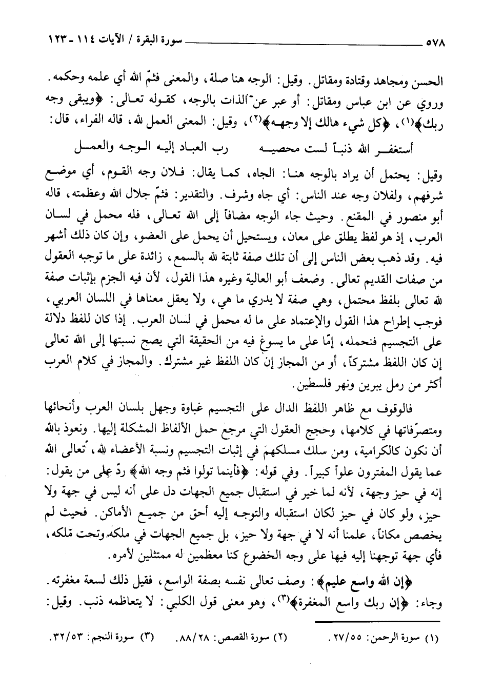 فَالْوُقُوفُ مَعَ ظَاهِرِ اللَّفْظِ الدَّالِّ عَلَى التَّجْسِيمِ غَبَاوَةٌ وَجَهْلٌ بِلِسَانِ الْعَرَبِ وَأَنْحَائِهَا وَمُتَصَرِّفَاتِهِا فِي كَلَامِهَا، وَحُجَجِ الْعُقُولِ الَّتِي مَرْجِعُ حَمْلِ الْأَلْفَاظِ الْمُشْكِلَةِ إِلَيْهَا. وَنَعُوذُ بِاللَّهِ أَنْ نَكُونَ كَالْكَرَّامِيَّةِ، وَمَنْ سَلَكَ مَسْلَكَهُمْ فِي إِثْبَاتِ التَّجْسِيمِ وَنِسْبَةِ الْأَعْضَاءِ لِلَّهِ، تَعَالَى اللَّهُ عَمَّا يَقُولُ الْمُفْتَرُونَ عُلُوًّا كَبِيرًا. وفي قوله: فَأَيْنَما تُوَلُّوا فَثَمَّ وَجْهُ اللَّهِ رَدٌّ عَلَى مَنْ يَقُولُ: