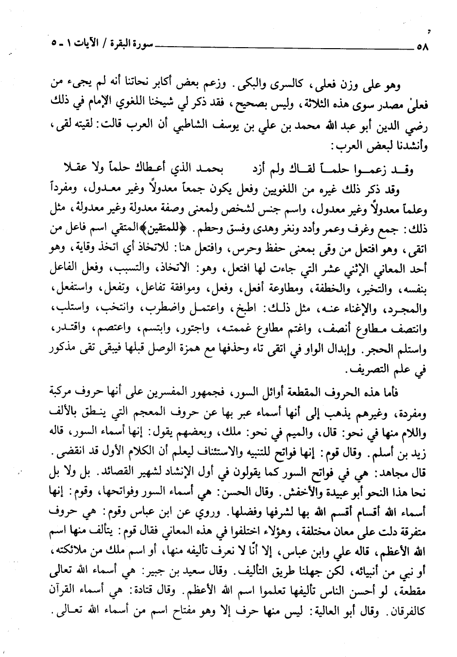 وَقَدْ ذَكَرَ ذَلِكَ غَيْرُهُ مِنَ اللُّغَوِيِّينَ وَفُعَلٌ يَكُونُ جَمْعًا مَعْدُولًا وَغَيْرَ مَعْدُولٍ، وَمُفْرَدًا وَعَلَمًا مَعْدُولًا وَغَيْرَ مَعْدُولٍ، وَاسْمَ جِنْسٍ لِشَخْصٍ وَلِمَعْنًى وَصِفَةً مَعْدُولَةً وَغَيْرَ مَعْدُولَةٍ، مِثْلُ ذَلِكَ: جُمَعٌ وَغُرَفٌ وَعُمَرٌ وَأُدَدٌ وَنُغَرٌ وَهُدًى وَفُسَقٌ وَحُطَمٌ. لِلْمُتَّقِينَ الْمُتَّقِي اسْمُ فَاعِلٍ مِنِ اتَّقَى، وَهُوَ افْتَعَلَ مِنْ وَقَى بِمَعْنَى حَفَظَ وَحَرَسَ، وَافْتَعَلَ هُنَا: لِلِاتِّخَاذِ أَيِ اتَّخَذَ وِقَايَةً، وَهُوَ أحد المعاني الاثنى عشر الَّتِي جَاءَتْ لَهَا افْتَعَلَ، وَهُوَ: الِاتِّخَاذُ، وَالتَّسَبُّبُ، وَفِعْلُ الْفَاعِلِ بِنَفْسِهِ، وَالتَّخَيُّرُ، وَالْخَطْفَةُ، وَمُطَاوَعَةُ افَّعَلَ، وَفَعَّلَ، وَمُوَافَقَةُ تَفَاعَلَ، وَتَفَعَّلَ، وَاسْتَفْعَلَ، وَالْمُجَرَّدُ، وَالْإِغْنَاءُ عَنْهُ، مِثْلُ ذَلِكَ: اطَّبَخَ، وَاعْتَمَلَ وَاضْطَرَبَ، وَانْتَخَبَ، وَاسْتَلَبَ، وَانْتَصَفَ مُطَاوِعُ أَنْصَفَ، وَاغْتَمَّ مُطَاوِعُ غَمَمْتُهُ، وَاجْتَوَرَ، وَابْتَسَمَ، وَاعْتَصَمَ، وَاقْتَدَرَ، وَاسْتَلَمَ الْحَجَرَ. وَإِبْدَالُ الْوَاوِ فِي اتَّقَى تَاءً وَحَذْفُهَا مَعَ هَمْزَةِ الْوَصْلِ قَبْلَهَا فَيَبْقَى تَقَى مَذْكُورٌ فِي عِلْمِ التَّصْرِيفِ.