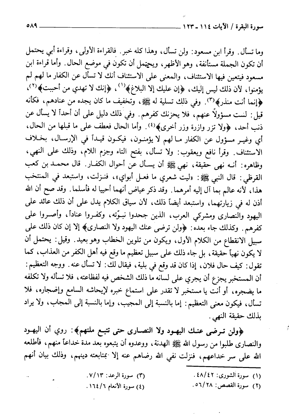 ، وَاسْتُبْعِدَ فِي الْمُنْتَخَبِ هَذَا، لِأَنَّهُ عَالِمٌ بِمَا آلَ إِلَيْهِ أَمْرُهُمَا. وَقَدْ ذَكَرَ عِيَاضٌ أَنَّهُمَا أُحْيِيَا لَهُ فَأَسْلَمَا. وَقَدْ صَحَّ أَنَّ اللَّهَ أَذِنَ لَهُ فِي زِيَارَتِهِمَا، وَاسْتُبْعِدَ أَيْضًا ذَلِكَ، لِأَنَّ سِيَاقَ الْكَلَامِ يَدُلُّ عَلَى أَنَّ ذَلِكَ عَائِدٌ عَلَى الْيَهُودِ وَالنَّصَارَى وَمُشْرِكِي الْعَرَبِ، الَّذِينَ جَحَدُوا نُبُوَّتَهُ، وَكَفَرُوا عِنَادًا، وَأَصَرُّوا عَلَى كُفْرِهِمْ. وَكَذَلِكَ جَاءَ بَعْدَهُ: وَلَنْ تَرْضى عَنْكَ الْيَهُودُ وَلَا النَّصارى إِلَّا إِنْ كَانَ ذَلِكَ عَلَى سَبِيلِ الِانْقِطَاعِ مِنَ الْكَلَامِ الْأَوَّلِ، وَيَكُونُ مِنْ تَلْوِينِ الْخِطَابِ وَهُوَ بَعِيدٌ. وَقِيلَ: يُحْتَمَلُ أَنْ لَا يَكُونَ نَهْيًا حَقِيقَةً، بَلْ جَاءَ ذَلِكَ عَلَى سَبِيلِ تَعْظِيمِ مَا وَقَعَ فِيهِ أَهْلُ الْكُفْرِ مِنَ الْعَذَابِ، كَمَا تَقُولُ: كَيْفَ حَالُ فُلَانٍ، إِذَا كَانَ قَدْ وَقَعَ فِي بَلِيَّةٍ، فَيُقَالُ لَكَ: لَا تَسْأَلْ عَنْهُ. وَوَجْهُ التَّعْظِيمِ: