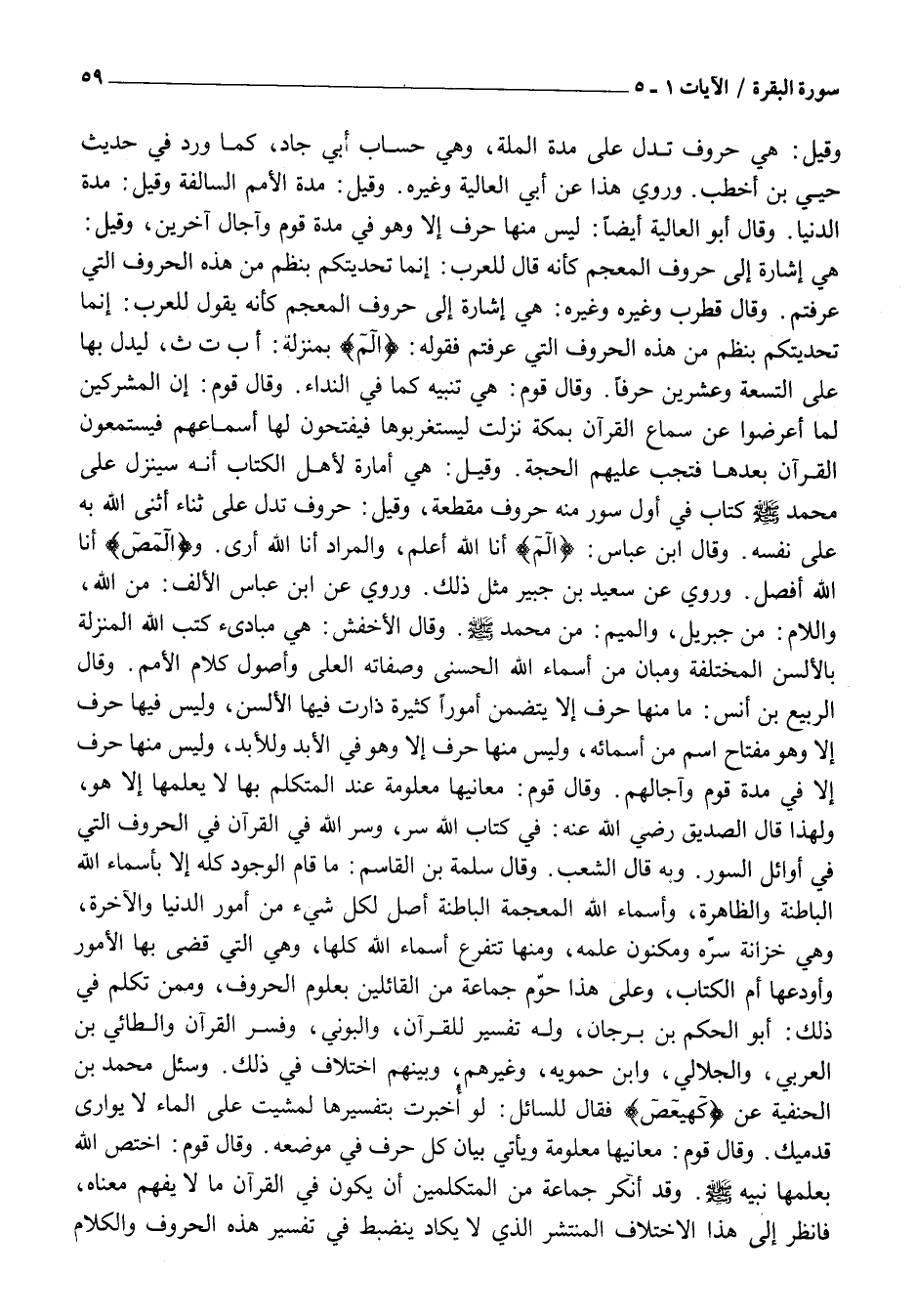 هِيَ إِشَارَةٌ إِلَى حُرُوفِ الْمُعْجَمِ كَأَنَّهُ قَالَ لِلْعَرَبِ: إِنَّمَا تَحَدَّيْتُكُمْ بِنَظْمٍ مِنْ هَذِهِ الْحُرُوفِ الَّتِي عَرَفْتُمْ. وَقَالَ قُطْرُبٌ وغيره وَغَيْرُهُ: هِيَ إِشَارَةٌ إِلَى حُرُوفِ الْمُعْجَمِ كَأَنَّهُ يَقُولُ لِلْعَرَبِ: إِنَّمَا تَحَدَّيْتُكُمْ بِنَظْمٍ مِنْ هَذِهِ الْحُرُوفِ الَّتِي عَرَفْتُمْ فَقَوْلُهُ: الم بِمَنْزِلَةِ: أب ت ث، لِيَدُلَّ بِهَا عَلَى التِّسْعَةِ وَعِشْرِينَ حَرْفًا. وَقَالَ قَوْمٌ: هِيَ تَنْبِيهٌ كَمَا فِي النِّدَاءِ. وَقَالَ قَوْمٌ: إِنَّ الْمُشْرِكِينَ لَمَّا أَعْرَضُوا عَنْ سَمَاعِ الْقُرْآنِ بِمَكَّةَ نَزَلَتْ لِيَسْتَغْرِبُوهَا فَيَفْتَحُونَ لَهَا أَسْمَاعَهُمْ فَيَسْتَمِعُونَ الْقُرْآنَ بَعْدَهَا فَتَجِبُ عَلَيْهِمُ الْحُجَّةَ. وَقِيلَ: هِيَ أَمَارَةٌ لِأَهْلِ الْكِتَابِ أَنَّهُ سَيَنْزِلُ عَلَى مُحَمَّدٍ صَلَّى اللَّهُ عليه وَسَلَّمَ كِتَابٌ فِي أَوَّلِ سُوَرٍ مِنْهُ حُرُوفٌ مُقَطَّعَةٌ، وَقِيلَ: حُرُوفٌ تَدُلُّ عَلَى ثَنَاءٍ أَثْنَى اللَّهُ بِهِ عَلَى نَفْسِهِ. وَقَالَ ابْنُ عَبَّاسٍ: ألم أَنَا اللَّهُ أَعْلَمُ، وَالْمُرَادُ أَنَا اللَّهُ أرى. والمص أَنَا اللَّهُ أَفْصِلُ. وَرُوِيَ عَنْ سَعِيدِ بْنِ جُبَيْرٍ مِثْلُ ذَلِكَ. وَرُوِيَ عَنِ ابْنِ عَبَّاسٍ الْأَلِفُ: مِنَ اللَّهِ، وَاللَّامُ: مِنْ جِبْرِيلَ، والميم: مِنْ مُحَمَّدٍ صَلَّى اللَّهُ عليه وسلّم. وَقَالَ الْأَخْفَشُ: هِيَ مَبَادِئُ كُتُبِ اللَّهِ الْمُنَزَّلَةِ بِالْأَلْسُنِ الْمُخْتَلِفَةِ وَمَبَانٍ مِنْ أَسْمَاءِ اللَّهِ الْحُسْنَى وَصِفَاتِهِ الْعُلَى وَأُصُولِ كَلَامِ الْأُمَمِ. وَقَالَ الرَّبِيعُ بْنُ أَنَسٍ: مَا مِنْهَا حَرْفٌ إِلَّا يَتَضَمَّنُ أمورا كثيرة ذارت فِيهَا الْأَلْسُنُ، وَلَيْسَ فِيهَا حَرْفٌ إِلَّا وَهُوَ مِفْتَاحُ اسْمٍ مِنْ أَسْمَائِهِ، وَلَيْسَ مِنْهَا حَرْفٌ إِلَّا وَهُوَ فِي الْأَبَدِ وَلِلْأَبَدِ، وَلَيْسَ مِنْهَا حَرْفٌ إِلَّا فِي مُدَّةِ قَوْمٍ وَآجَالِهِمْ. وَقَالَ قَوْمٌ: مَعَانِيهَا مَعْلُومَةٌ عِنْدَ الْمُتَكَلِّمِ بِهَا لَا يَعْلَمُهَا إِلَّا هُوَ، وَلِهَذَا قَالَ الصِّدِّيقُ رَضِيَ اللَّهُ عَنْهُ: فِي كِتَابِ اللَّهِ سِرٌّ، وَسِرُّ اللَّهِ فِي الْقُرْآنِ فِي الْحُرُوفِ الَّتِي فِي أَوَائِلِ السُّوَرِ. وَبِهِ قَالَ الشعب. وَقَالَ سَلَمَةُ بْنُ الْقَاسِمِ: مَا قَامَ الْوُجُودُ كُلُّهُ إِلَّا بِأَسْمَاءِ اللَّهِ الْبَاطِنَةِ وَالظَّاهِرَةِ، وَأَسْمَاءِ اللَّهِ الْمُعْجَمَةِ الْبَاطِنَةِ أَصْلٌ لِكُلِّ شَيْءٍ مِنْ أُمُورِ الدُّنْيَا وَالْآخِرَةِ، وَهِيَ خِزَانَةُ سِرِّهِ وَمَكْنُونُ عِلْمِهِ، وَمِنْهَا تَتَفَرَّعُ أَسْمَاءُ اللَّهِ كُلُّهَا، وَهِيَ الَّتِي قَضَى بِهَا الْأُمُورَ وَأَوْدَعَهَا أُمَّ الْكِتَابِ، وَعَلَى هَذَا حَوَّمَ جَمَاعَةٌ مِنَ الْقَائِلِينَ بِعُلُومِ الْحُرُوفِ، وَمِمَّنْ تَكَلَّمَ فِي ذَلِكَ: أَبُو الْحَكَمِ بْنُ بُرْجَانَ، وَلَهُ تَفْسِيرٌ لِلْقُرْآنِ، وَالْبَوْنِيُّ، وَفَسَّرَ الْقُرْآنَ وَالطَّائِيُّ بْنُ الْعَرَبِيِّ، وَالْجَلَالِيُّ، وَابْنُ حَمُّوَيْهِ، وَغَيْرُهُمْ، وَبَيْنَهُمُ اخْتِلَافٌ فِي ذَلِكَ. وَسُئِلَ مُحَمَّدُ بْنُ الْحَنَفِيَّةِ عَنْ كهيعص فَقَالَ لِلسَّائِلِ: لَوْ أُخْبِرْتَ بِتَفْسِيرِهَا لَمَشَيْتَ عَلَى الْمَاءِ لَا يُوَارِي قَدَمَيْكَ. وَقَالَ قَوْمٌ: مَعَانِيهَا مَعْلُومَةٌ وَيَأْتِي بَيَانُ كُلِّ حَرْفٍ فِي مَوْضِعِهِ. وَقَالَ قَوْمٌ: اخْتَصَّ اللَّهُ بِعِلْمِهَا نَبِيَّهُ صَلَّى اللَّهُ عَلَيْهِ وسلم. وَقَدْ أَنْكَرَ جَمَاعَةٌ مِنَ الْمُتَكَلِّمِينَ أَنْ يَكُونَ فِي الْقُرْآنِ مَا لَا يُفْهَمُ مَعْنَاهُ، فَانْظُرْ إِلَى هَذَا الاختلاف المنتشر الذي لا يَكَاد
