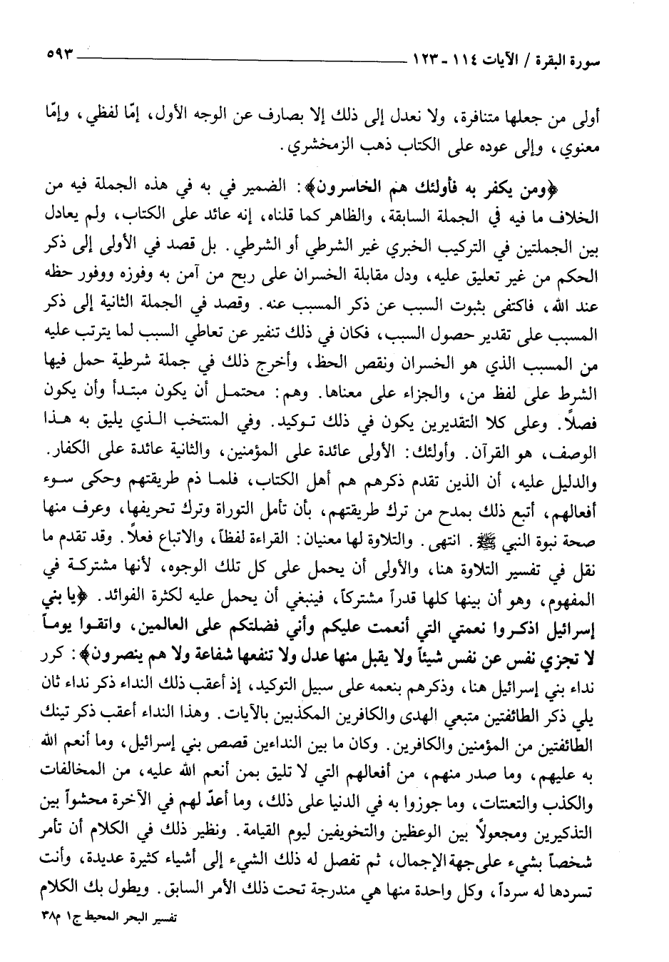 وَالدَّلِيلُ عَلَيْهِ، أَنَّ الَّذِينَ تَقَدَّمَ ذِكْرُهُمْ هُمْ أَهْلُ الْكِتَابِ، فَلَمَّا ذَمَّ طَرِيقَتَهُمْ وَحَكَى سُوءَ أَفْعَالِهِمْ، أَتْبَعَ ذَلِكَ بِمَدْحِ مَنْ تَرَكَ طَرِيقَتَهُمْ، بِأَنْ تَأَمَّلَ التَّوْرَاةَ وَتَرَكَ تَحْرِيفَهَا، وَعَرَفَ مِنْهَا صحة نُبُوَّةِ النَّبِيِّ صَلَّى اللَّهُ عَلَيْهِ وَسَلَّمَ. انْتَهَى. وَالتِّلَاوَةُ لَهَا مَعْنَيَانِ: الْقِرَاءَةُ لَفْظًا، وَالِاتِّبَاعُ فِعْلًا. وَقَدْ تَقَدَّمَ مَا نُقِلَ فِي تَفْسِيرِ التِّلَاوَةِ هُنَا، وَالْأَوْلَى أَنْ يُحْمَلَ عَلَى كُلِّ تِلْكَ الْوُجُوهِ، لِأَنَّهَا مُشْتَرَكَةٌ فِي الْمَفْهُومِ، وَهُوَ أَنَّ بَيْنَهَا كُلِّهَا قَدْرًا مُشْتَرَكًا، فَيَنْبَغِي أَنْ يُحْمَلَ عَلَيْهِ لِكَثْرَةِ الْفَوَائِدِ. يَا بَنِي إِسْرائِيلَ اذْكُرُوا نِعْمَتِيَ الَّتِي أَنْعَمْتُ عَلَيْكُمْ وَأَنِّي فَضَّلْتُكُمْ عَلَى الْعالَمِينَ، وَاتَّقُوا يَوْماً لَا تَجْزِي نَفْسٌ عَنْ نَفْسٍ شَيْئاً وَلا يُقْبَلُ مِنْها عَدْلٌ وَلا تَنْفَعُها شَفاعَةٌ وَلا هُمْ يُنْصَرُونَ: كَرَّرَ نِدَاءَ بَنِي إِسْرَائِيلَ هُنَا، وَذَكَّرَهُمْ بِنِعَمِهِ عَلَى سَبِيلِ التَّوْكِيدِ، إِذْ أَعْقَبَ ذَلِكَ النِّدَاءَ ذِكْرَ نِدَاءٍ ثَانٍ يَلِي ذِكْرَ الطَّائِفَتَيْنِ مُتَّبِعِي الْهُدَى وَالْكَافِرِينَ الْمُكَذِّبِينَ بِالْآيَاتِ. وَهَذَا النِّدَاءُ أَعْقَبَ ذكر تينك الطَّائِفَتَيْنِ مِنَ الْمُؤْمِنِينَ وَالْكَافِرِينَ. وَكَانَ مَا بَيْنَ النِّدَاءَيْنِ قَصَصُ بَنِي إِسْرَائِيلَ، وَمَا أَنْعَمَ اللَّهُ بِهِ عَلَيْهِمْ، وَمَا صَدَرَ مِنْهُمْ، مِنْ أَفْعَالِهِمُ الَّتِي لَا تَلِيقُ بِمَنْ أَنْعَمَ اللَّهُ عَلَيْهِ، مِنَ الْمُخَالَفَاتِ وَالْكَذِبِ وَالتَّعَنُّتَاتِ، وَمَا جُوزُوا بِهِ فِي الدُّنْيَا عَلَى ذَلِكَ، وَمَا أُعِدَّ لَهُمْ فِي الْآخِرَةِ مَحْشُوًّا بَيْنَ التَّذْكِيرَيْنِ وَمَجْعُولًا بَيْنَ الْوَعْظَيْنِ وَالتَّخْوِيفَيْنِ لِيَوْمِ الْقِيَامَةِ. وَنَظِيرُ ذَلِكَ فِي الْكَلَامِ أَنْ تَأْمُرَ شَخْصًا بِشَيْءٍ عَلَى جِهَةِ الْإِجْمَالِ، ثُمَّ تُفَصِّلَ لَهُ ذَلِكَ الشَّيْءَ إِلَى أَشْيَاءَ كَثِيرَةٍ عَدِيدَةٍ، وَأَنْتَ تَسْرُدُهَا لَهُ سَرْدًا، وَكُلُّ وَاحِدَةٍ مِنْهَا هِيَ مُنْدَرِجَةٌ تَحْتَ ذَلِكَ الْأَمْرِ السَّابِقِ. وَيَطُولُ بِكَ الْكَلَامُ
