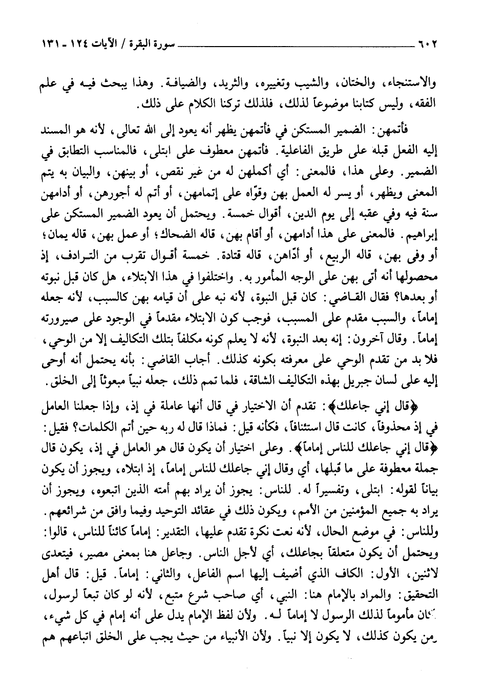 فَأَتَمَّهُنَّ: الضَّمِيرُ الْمُسْتَكِنُّ فِي فَأَتَمَّهُنَّ يُظْهِرُ أَنَّهُ يَعُودُ إِلَى اللَّهِ تَعَالَى، لِأَنَّهُ هُوَ الْمُسْنَدُ إِلَيْهِ الْفِعْلُ قَبْلَهُ عَلَى طَرِيقِ الْفَاعِلِيَّةِ. فَأَتَمَّهُنَّ مَعْطُوفٌ عَلَى ابْتَلَى، فَالْمُنَاسِبُ التَّطَابُقُ فِي الضَّمِيرِ. وَعَلَى هَذَا، فَالْمَعْنَى: أَيْ أَكْمَلَهُنَّ لَهُ مِنْ غَيْرِ نَقْصٍ، أَوْ بَيَّنَهُنَّ، وَالْبَيَانُ بِهِ يَتِمُّ الْمَعْنَى وَيَظْهَرُ، أَوْ يَسَّرَ لَهُ الْعَمَلَ بِهِنَّ وَقَوَّاهُ عَلَى إِتْمَامِهِنَّ، أَوْ أَتَمَّ لَهُ أُجُورَهُنَّ، أَوْ أَدَامَهُنَّ سُنَّةً فِيهِ وَفِي عَقِبِهِ إِلَى يَوْمِ الدِّينِ، أَقْوَالٌ خَمْسَةٌ. وَيُحْتَمَلُ أَنْ يَعُودَ الضَّمِيرُ الْمُسْتَكِنُّ عَلَى إِبْرَاهِيمَ. فَالْمَعْنَى عَلَى هَذَا أَدَامَهُنَّ، أَوْ أَقَامَ بِهِنَّ، قَالَهُ الضَّحَّاكُ أَوْ عَمِلَ بِهِنَّ، قَالَهُ يَمَانٌ أَوْ وَفَّى بِهِنَّ، قَالَهُ الرَّبِيعُ، أَوْ أَدَّاهُنَّ، قَالَهُ قَتَادَةُ. خَمْسَةُ أَقْوَالٍ تُقَرِّبُ مِنَ التَّرَادُفِ، إِذْ مَحْصُولُهَا أَنَّهُ أَتَى بِهِنَّ عَلَى الْوَجْهِ الْمَأْمُورِ بِهِ. وَاخْتَلَفُوا فِي هَذَا الِابْتِلَاءِ، هَلْ كَانَ قَبْلَ نُبُوَّتِهِ أَوْ بَعْدَهَا؟ فَقَالَ الْقَاضِي: كَانَ قَبْلَ النُّبُوَّةِ، لِأَنَّهُ نَبَّهَ عَلَى أَنَّ قِيَامَهُ بِهِنَّ كَالسَّبَبِ، لِأَنَّهُ جَعَلَهُ إِمَامًا، وَالسَّبَبُ مُقَدَّمٌ عَلَى الْمُسَبِّبِ، فَوَجَبَ كَوْنُ الِابْتِلَاءِ مُقَدَّمًا فِي الْوُجُودِ عَلَى صَيْرُورَتِهِ إِمَامًا. وَقَالَ آخَرُونَ: إِنَّهُ بَعْدَ النُّبُوَّةِ، لِأَنَّهُ لَا يَعْلَمُ كَوْنَهُ مُكَلَّفًا بِتِلْكَ التَّكَالِيفِ إِلَّا مِنَ الْوَحْيِ، فَلَا بُدَّ مِنْ تَقَدُّمِ الْوَحْيِ عَلَى مَعْرِفَتِهِ بِكَوْنِهِ كَذَلِكَ. أَجَابَ الْقَاضِي: بِأَنَّهُ يُحْتَمَلُ أَنَّهُ أَوْحَى إِلَيْهِ عَلَى لِسَانِ جِبْرِيلَ بِهَذِهِ التَّكَالِيفِ الشَّاقَّةِ، فَلَمَّا تَمَّمَ ذَلِكَ، جَعَلَهُ نَبِيًّا مَبْعُوثًا إِلَى الْخَلْقِ.