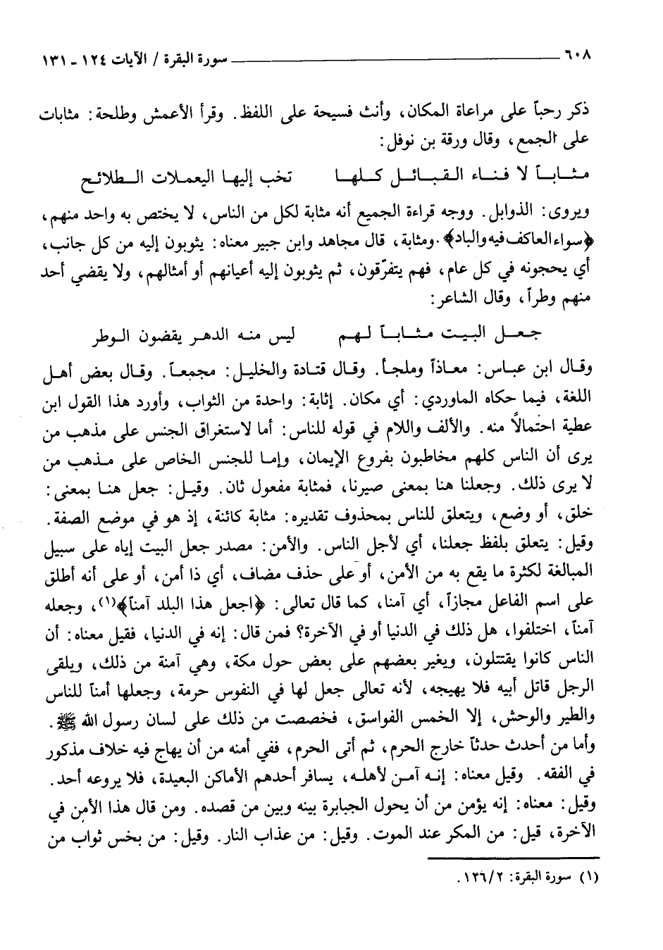 وَقَالَ ابْنُ عَبَّاسٍ: مَعَاذًا وَمَلْجَأً. وَقَالَ قَتَادَةُ وَالْخَلِيلُ: مَجْمَعًا. وَقَالَ بَعْضُ أَهْلِ اللُّغَةِ، فِيمَا حَكَاهُ الْمَاوَرْدِيُّ: أَيْ مَكَانَ. إِثَابَةٍ: وَاحِدَةٌ مِنَ الثَّوَابِ، وَأَوْرَدَ هَذَا الْقَوْلَ ابْنُ عَطِيَّةً احْتِمَالًا مِنْهُ. وَالْأَلِفُ وَاللَّامُ فِي قَوْلِهِ لِلنَّاسِ: إِمَّا لِاسْتِغْرَاقِ الْجِنْسِ عَلَى مَذْهَبِ مَنْ يَرَى أَنَّ النَّاسَ كُلَّهُمْ مُخَاطَبُونَ بِفُرُوعِ الْإِيمَانِ، وَإِمَّا لِلْجِنْسِ الْخَاصِّ عَلَى مَذْهَبِ مَنْ لَا يَرَى ذَلِكَ. وَجَعَلْنَا هُنَا بِمَعْنَى صَيَّرْنَا، فَمَثَابَةٌ مَفْعُولٌ ثَانٍ. وَقِيلَ: جَعَلَ هُنَا بِمَعْنَى: