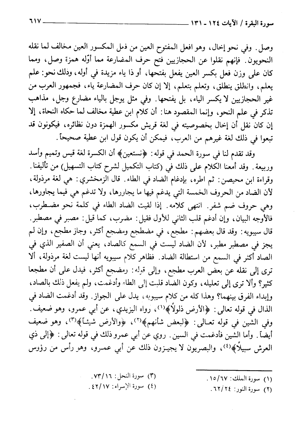 وَقَدْ تَقَدَّمَ لَنَا فِي سُورَةِ الْحَمْدِ فِي قَوْلِهِ: نَسْتَعِينُ أَنَّ الْكَسْرَةَ لُغَةُ قَيْسٍ وَتَمِيمٍ وَأَسَدٍ وَرَبِيعَةَ. وَقَدْ أَمْعَنَّا الْكَلَامَ عَلَى ذَلِكَ فِي (كِتَابِ التَّكْمِيلِ لِشَرْحِ كِتَابِ التَّسْهِيلِ) مِنْ تَأْلِيفِنَا.