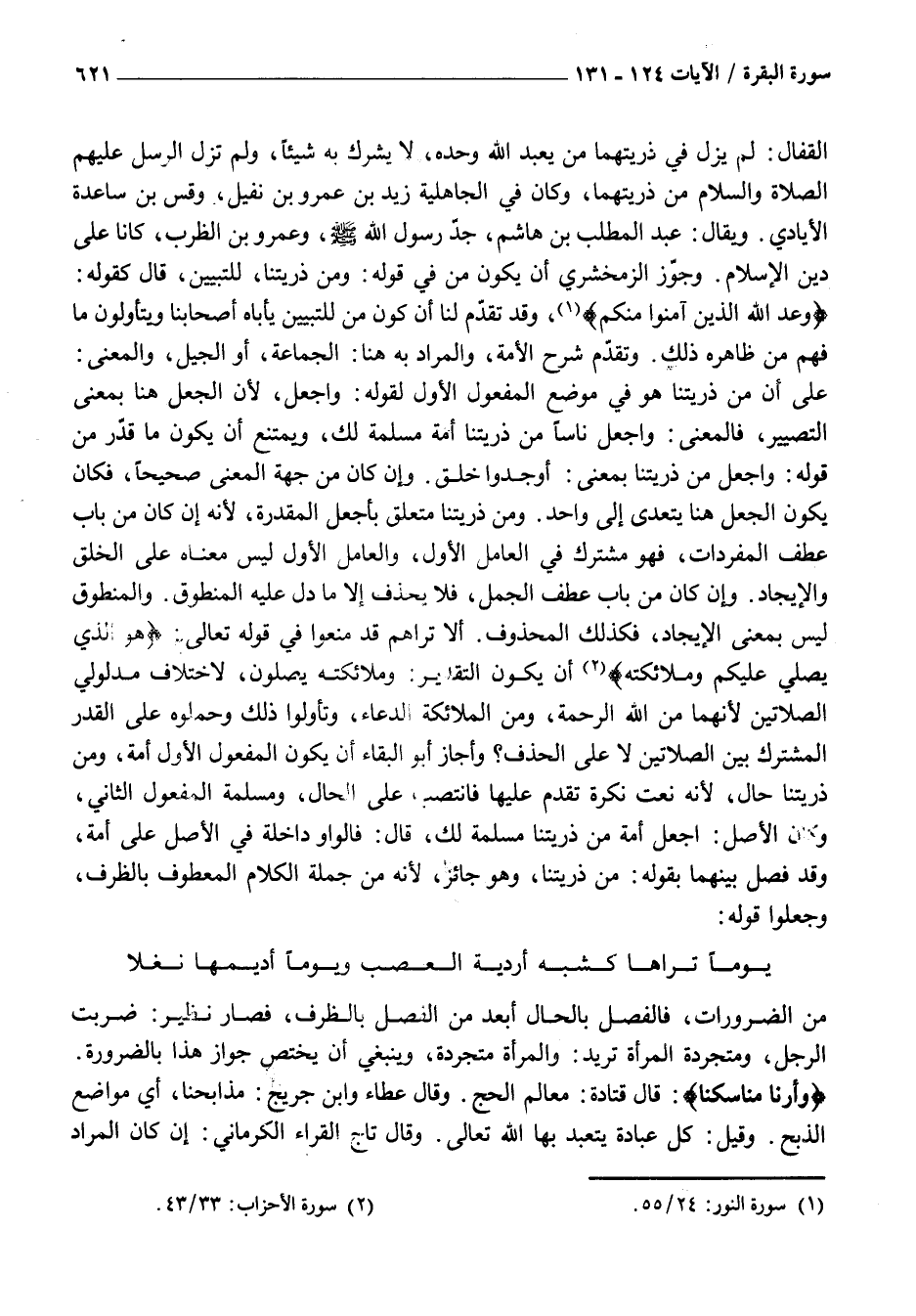 عَلَى أَنَّ مِنْ ذُرِّيَّتِنَا هُوَ فِي مَوْضِعِ الْمَفْعُولِ الْأَوَّلِ لِقَوْلِهِ: وَاجْعَلْ، لِأَنَّ الْجَعْلَ هُنَا بِمَعْنَى التَّصْيِيرِ، فَالْمَعْنَى: وَاجْعَلْ نَاسًا مِنْ ذُرِّيَّتِنَا أُمَّةً مُسْلِمَةً لَكَ، وَيَمْتَنِعُ أَنْ يَكُونَ مَا قُدِّرَ مِنْ قَوْلِهِ: وَاجْعَلْ مِنْ ذُرِّيَّتِنَا بمعنى: أوجدوا خلق. وَإِنْ كَانَ مِنْ جِهَةِ الْمَعْنَى صَحِيحًا، فَكَانَ يَكُونُ الْجَعْلُ هُنَا يَتَعَدَّى إِلَى وَاحِدٍ. وَمِنْ ذُرِّيَّتِنَا مُتَعَلِّقٌ بِاجْعَلِ الْمُقَدَّرَةِ، لِأَنَّهُ إِنْ كَانَ مِنْ بَابِ عَطْفِ الْمُفْرَدَاتِ، فَهُوَ مُشْتَرِكٌ فِي الْعَامِلِ الْأَوَّلِ، وَالْعَامِلُ الْأَوَّلِ لَيْسَ مَعْنَاهُ عَلَى الْخَلْقِ وَالْإِيجَادِ. وَإِنْ كَانَ مِنْ بَابِ عَطْفِ الْجُمَلِ، فَلَا يُحْذَفُ إِلَّا مَا دَلَّ عَلَيْهِ الْمَنْطُوقُ. وَالْمَنْطُوقُ لَيْسَ بِمَعْنَى الْإِيجَادِ، فَكَذَلِكَ الْمَحْذُوفُ. أَلَا تَرَاهُمْ قَدْ مَنَعُوا فِي قَوْلِهِ تَعَالَى: هُوَ الَّذِي يُصَلِّي عَلَيْكُمْ وَمَلائِكَتُهُ «2» أَنْ يَكُونَ التَّقْدِيرُ: وَمَلَائِكَتُهُ يُصَلُّونَ، لِاخْتِلَافِ مَدْلُولَيِ الصَّلَاتَيْنِ لِأَنَّهُمَا مِنَ اللَّهِ الرَّحْمَةُ، وَمِنَ الْمَلَائِكَةِ الدُّعَاءُ، وَتَأَوَّلُوا ذَلِكَ وَحَمَلُوهُ عَلَى الْقَدْرِ الْمُشْتَرَكِ بَيْنَ الصَّلَاتَيْنِ لَا عَلَى الْحَذْفِ؟ وَأَجَازَ أَبُو الْبَقَاءِ أَنْ يَكُونَ الْمَفْعُولُ الْأَوَّلُ أُمَّةً، وَمِنْ ذُرِّيَّتِنَا حَالٌ، لِأَنَّهُ نَعْتٌ نَكِرَةٌ تَقَدَّمَ عَلَيْهَا فَانْتَصَبَ عَلَى الْحَالِ، وَمُسْلِمَةٌ الْمَفْعُولُ الثَّانِي، وَكَانَ الْأَصْلُ: اجْعَلْ أُمَّةً مِنْ ذُرِّيَّتِنَا مُسْلِمَةً لَكَ، قَالَ: فَالْوَاوُ دَاخِلَةٌ فِي الْأَصْلِ عَلَى أُمَّةٍ، وَقَدْ فُصِلَ بَيْنَهُمَا بِقَوْلِهِ: مِنْ ذُرِّيَّتِنَا، وَهُوَ جَائِزٌ، لِأَنَّهُ مِنْ جُمْلَةِ الْكَلَامِ الْمَعْطُوفِ بِالظَّرْفِ، وَجَعَلُوا قَوْلَهُ:
