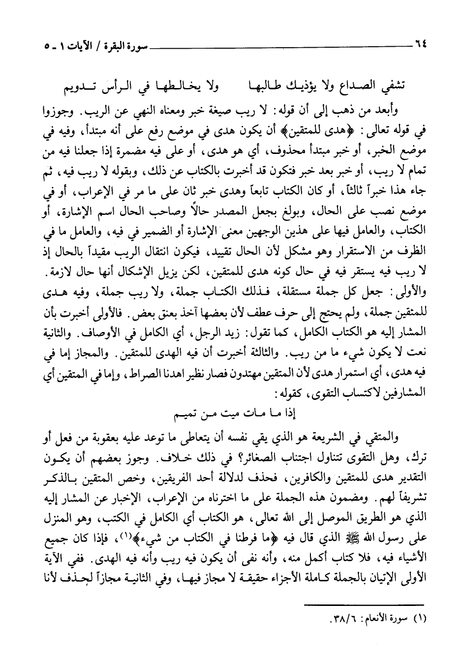 إِذَا مَا مَاتَ مَيِّتُ مِنْ تَمِيمٍ وَالْمُتَّقِي فِي الشَّرِيعَةِ هُوَ الَّذِي يَقِي نَفْسَهُ أَنْ يَتَعَاطَى مَا تُوُعِّدَ عَلَيْهِ بِعُقُوبَةٍ مِنْ فِعْلٍ أَوْ تَرْكٍ، وَهَلِ التَّقْوَى تَتَنَاوَلُ اجْتِنَابَ الصَّغَائِرِ؟ فِي ذَلِكَ خِلَافٌ. وَجَوَّزَ بَعْضُهُمْ أَنْ يَكُونَ التَّقْدِيرُ هُدًى لِلْمُتَّقِينَ وَالْكَافِرِينَ، فَحُذِفَ لِدَلَالَةِ أَحَدِ الْفَرِيقَيْنِ، وَخَصَّ الْمُتَّقِينَ بِالذِّكْرِ تَشْرِيفًا لَهُمْ. وَمَضْمُونُ هَذِهِ الْجُمْلَةِ عَلَى مَا اخْتَرْنَاهُ مِنَ الْإِعْرَابِ، الْإِخْبَارُ عَنِ الْمُشَارِ إِلَيْهِ الَّذِي هُوَ الطَّرِيقُ الْمُوَصِّلُ إِلَى اللَّهِ تَعَالَى، هُوَ الْكِتَابُ أَيِ الْكَامِلُ فِي الْكُتُبِ، وَهُوَ المنزل عَلَى رَسُولِ اللَّهِ صَلَّى اللَّهُ عَلَيْهِ وَسَلَّمَ الَّذِي قَالَ فِيهِ مَا فَرَّطْنا فِي الْكِتابِ مِنْ شَيْءٍ «1» ، فَإِذَا كَانَ جَمِيعُ الْأَشْيَاءِ فِيهِ، فَلَا كِتَابَ أَكْمَلُ مِنْهُ، وَأَنَّهُ نَفَى أَنْ يَكُونَ فِيهِ رَيْبٌ وَأَنَّهُ فِيهِ الْهُدَى. فَفِي الْآيَةِ الْأُولَى الْإِتْيَانُ بِالْجُمْلَةِ كَامِلَةَ الْأَجْزَاءِ حَقِيقَةً لَا مَجَازَ فِيهَا، وَفِي الثَّانِيَةِ مجازا لحذف لأنا