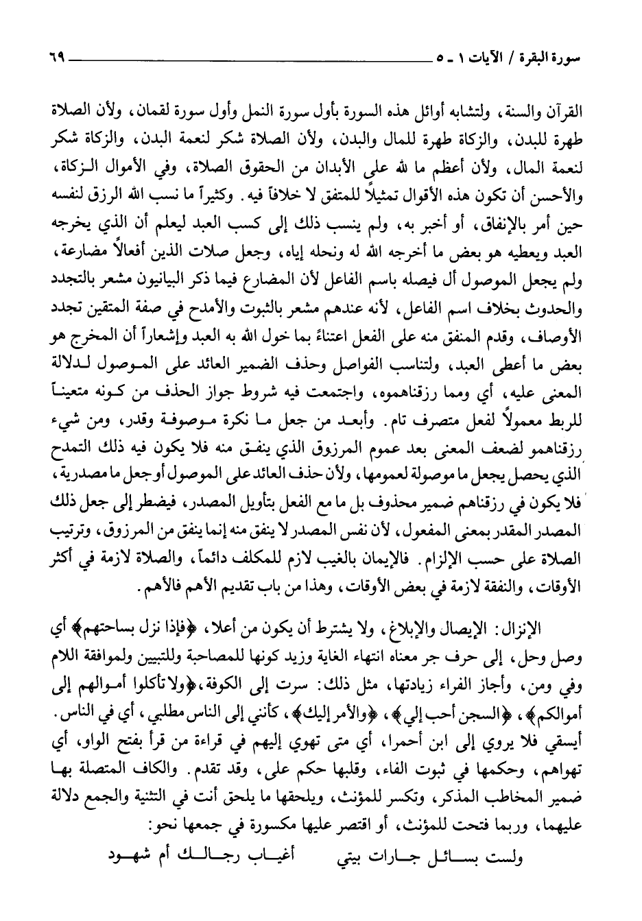 الْقُرْآنِ وَالسُّنَّةِ، وَلِتَشَابُهِ أَوَائِلِ هَذِهِ السُّورَةِ بِأَوَّلِ سُورَةِ النَّمْلِ وَأَوَّلِ سُورَةِ لُقْمَانَ، وَلِأَنَّ الصَّلَاةَ طُهْرَةٌ لِلْبَدَنِ، وَالزَّكَاةَ طُهْرَةٌ لِلْمَالِ وَالْبَدَنِ، وَلِأَنَّ الصَّلَاةَ شُكْرٌ لِنِعْمَةِ الْبَدَنِ، وَالزَّكَاةَ شُكْرٌ لِنِعْمَةِ الْمَالِ، وَلِأَنَّ أَعْظَمَ مَا لِلَّهِ عَلَى الْأَبْدَانِ مِنَ الْحُقُوقِ الصَّلَاةُ، وَفِي الْأَمْوَالِ الزَّكَاةُ، وَالْأَحْسَنُ أَنْ تَكُونَ هَذِهِ الْأَقْوَالُ تَمْثِيلًا لِلْمُتَّفَقِ لَا خِلَافًا فِيهِ. وَكَثِيرًا مَا نَسَبَ اللَّهُ الرِّزْقَ لِنَفْسِهِ حِينَ أَمَرَ بِالْإِنْفَاقِ، أَوْ أَخْبَرَ بِهِ، وَلَمْ يَنْسِبْ ذَلِكَ إِلَى كَسْبِ الْعَبْدِ لِيَعْلَمَ أَنَّ الَّذِي يُخْرِجُهُ الْعَبْدُ وَيُعْطِيهِ هُوَ بَعْضُ مَا أَخْرَجَهُ اللَّهُ لَهُ وَنَحَلَهُ إِيَّاهُ، وَجَعَلَ صِلَاتِ الَّذِينَ أَفْعَالًا مُضَارِعَةً، وَلَمْ يَجْعَلِ الْمَوْصُولَ أَلْ فَيَصِلَهُ بِاسْمِ الْفَاعِلِ لِأَنَّ الْمُضَارِعَ فِيمَا ذَكَرَ الْبَيَانِيُّونَ مُشْعِرٌ بِالتَّجَدُّدِ وَالْحُدُوثِ بِخِلَافِ اسْمِ الْفَاعِلِ، لِأَنَّهُ عِنْدَهُمْ مُشْعِرٌ بِالثُّبُوتِ وَالْأَمْدَحُ فِي صِفَةِ الْمُتَّقِينَ تَجَدُّدُ الْأَوْصَافِ، وَقَدَّمَ الْمُنْفَقَ مِنْهُ عَلَى الْفِعْلِ اعْتِنَاءً بِمَا خَوَّلَ اللَّهُ بِهِ الْعَبْدَ وَإِشْعَارًا أَنَّ الْمُخْرَجَ هُوَ بَعْضُ مَا أَعْطَى الْعَبْدَ، وَلِتَنَاسُبِ الْفَوَاصِلِ وَحَذْفِ الضَّمِيرِ الْعَائِدِ عَلَى الْمَوْصُولِ لِدَلَالَةِ الْمَعْنَى عَلَيْهِ، أَيْ وَمِمَّا رَزَقْنَاهُمُوهُ، وَاجْتَمَعَتْ فِيهِ شُرُوطُ جَوَازِ الْحَذْفِ مِنْ كَوْنِهِ مُتَعَيَّنًا لِلرَّبْطِ مَعْمُولًا لِفِعْلٍ مُتَصَرِّفٍ تَامٍّ. وَأَبْعَدَ مَنْ جَعَلَ مَا نَكِرَةً مَوْصُوفَةً وَقَدَّرَ، ومن شيء رزقناهمو لِضَعْفِ الْمَعْنَى بَعْدَ عُمُومِ الْمَرْزُوقِ الَّذِي يُنْفَقُ مِنْهُ فَلَا يَكُونُ فِيهِ ذَلِكَ التمدح الذي يحصل يجعل مَا مَوْصُولَةً لِعُمُومِهَا، وَلِأَنَّ حَذْفَ الْعَائِدِ عَلَى الْمَوْصُولِ أَوْ جَعْلَ مَا مَصْدَرِيَّةً، فَلَا يَكُونُ فِي رَزَقْنَاهُمْ ضَمِيرٌ مَحْذُوفٌ بَلْ مَا مَعَ الْفِعْلِ بِتَأْوِيلِ الْمَصْدَرِ، فَيُضْطَرُّ إِلَى جَعْلِ ذَلِكَ الْمَصْدَرِ الْمُقَدَّرِ بِمَعْنَى الْمَفْعُولِ، لِأَنَّ نَفْسَ الْمَصْدَرِ لَا يُنْفَقُ مِنْهُ إِنَّمَا يُنْفَقُ مِنَ الْمَرْزُوقِ، وَتَرْتِيبُ الصَّلَاةِ عَلَى حَسَبِ الْإِلْزَامِ. فَالْإِيمَانُ بِالْغَيْبِ لَازِمٌ لِلْمُكَلَّفِ دَائِمًا، وَالصَّلَاةُ لَازِمَةٌ فِي أَكْثَرِ الْأَوْقَاتِ، وَالنَّفَقَةُ لَازِمَةٌ فِي بَعْضِ الْأَوْقَاتِ، وَهَذَا مِنْ بَابِ تَقْدِيمِ الْأَهَمِّ فَالْأَهَمِّ.