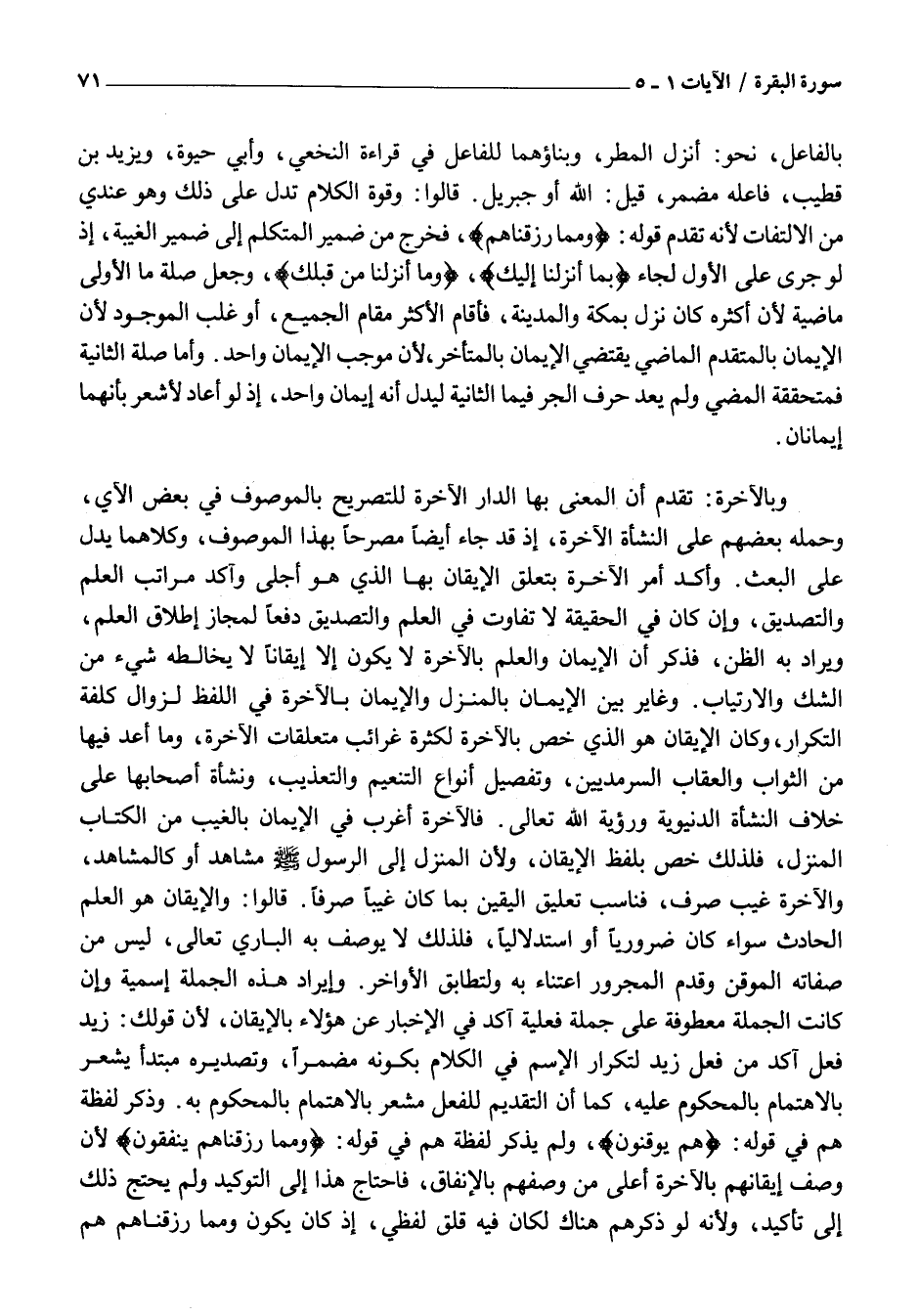 وَبِالْآخِرَةِ: تَقَدَّمَ أَنَّ الْمَعْنِيَّ بِهَا الدَّارُ الْآخِرَةُ لِلتَّصْرِيحِ بِالْمَوْصُوفِ فِي بَعْضِ الْآيِ، وَحَمَلَهُ بَعْضُهُمْ عَلَى النَّشْأَةِ الْآخِرَةِ، إِذْ قَدْ جَاءَ أَيْضًا مُصَرَّحًا بِهَذَا الْمَوْصُوفِ، وَكِلَاهُمَا يَدُلُّ عَلَى الْبَعْثِ. وَأَكَّدَ أَمْرَ الْآخِرَةِ بِتَعَلُّقِ الْإِيقَانِ بِهَا الَّذِي هُوَ أَجْلَى وَآكَدُ مَرَاتِبِ الْعِلْمِ وَالتَّصْدِيقِ، وَإِنْ كَانَ فِي الْحَقِيقَةِ لَا تَفَاوُتَ فِي الْعِلْمِ وَالتَّصْدِيقِ دَفْعًا لِمَجَازِ إِطْلَاقِ الْعِلْمِ، وَيُرَادُ بِهِ الظَّنُّ، فَذَكَرَ أَنَّ الْإِيمَانَ وَالْعِلْمَ بِالْآخِرَةِ لَا يَكُونُ إِلَّا إِيقَانًا لَا يُخَالِطُهُ شَيْءٌ مِنَ الشَّكِّ وَالِارْتِيَابِ. وَغَايَرَ بَيْنَ الْإِيمَانِ بِالْمُنَزَّلِ وَالْإِيمَانِ بِالْآخِرَةِ فِي اللَّفْظِ لِزَوَالِ كُلْفَةِ التَّكْرَارِ، وَكَانَ الْإِيقَانُ هُوَ الَّذِي خُصَّ بِالْآخِرَةِ لِكَثْرَةِ غَرَائِبِ مُتَعَلِّقَاتِ الْآخِرَةِ، وَمَا أُعِدَّ فِيهَا مِنَ الثَّوَابِ وَالْعِقَابِ السَّرْمَدِيَّيْنِ، وَتَفْصِيلُ أَنْوَاعِ التَّنْعِيمِ وَالتَّعْذِيبِ، وَنَشْأَةُ أَصْحَابِهَا عَلَى خِلَافِ النَّشْأَةِ الدُّنْيَوِيَّةِ وَرُؤْيَةُ اللَّهِ تَعَالَى. فَالْآخِرَةُ أَغْرَبُ فِي الْإِيمَانِ بِالْغَيْبِ مِنَ الْكِتَابِ الْمُنَزَّلِ، فَلِذَلِكَ خَصَّ بِلَفْظِ الْإِيقَانِ، وَلِأَنَّ الْمُنَزَّلَ إِلَى الرَّسُولِ صَلَّى اللَّهُ عليه وسلم مُشَاهَدٌ أَوْ كَالْمُشَاهَدِ، وَالْآخِرَةُ غَيْبٌ صِرْفٌ، فَنَاسَبَ تَعْلِيقَ الْيَقِينِ بِمَا كَانَ غَيْبًا صِرْفًا. قَالُوا: وَالْإِيقَانُ هُوَ الْعِلْمُ الْحَادِثُ سَوَاءٌ كَانَ ضَرُورِيًّا أَوِ اسْتِدْلَالِيًّا، فَلِذَلِكَ لَا يُوصَفُ بِهِ الْبَارِي تَعَالَى، لَيْسَ مِنْ صِفَاتِهِ الْمُوقِنُ وَقُدِّمَ الْمَجْرُورُ اعْتِنَاءً بِهِ وَلِتَطَابُقِ الْأَوَاخِرِ. وَإِيرَادُ هَذِهِ الْجُمْلَةِ اسْمِيَّةً وَإِنْ كَانَتِ الْجُمْلَةُ مَعْطُوفَةً عَلَى جُمْلَةٍ فِعْلِيَّةٍ آكَدُ فِي الْإِخْبَارِ عَنْ هَؤُلَاءِ بِالْإِيقَانِ، لِأَنَّ قَوْلَكَ: زَيْدٌ فَعَلَ آكَدُ مِنْ فَعَلَ زَيْدٌ لِتَكْرَارِ الِاسْمِ فِي الْكَلَامِ بِكَوْنِهِ مُضْمَرًا، وَتَصْدِيرِهِ مُبْتَدَأٌ يُشْعِرُ بِالِاهْتِمَامِ بِالْمَحْكُومِ عَلَيْهِ، كَمَا أَنَّ التَّقْدِيمَ لِلْفِعْلِ مُشْعِرٌ بِالِاهْتِمَامِ بِالْمَحْكُومِ بِهِ. وَذَكَرَ لَفْظَةَ هُمْ فِي قَوْلِهِ: هُمْ يُوقِنُونَ، وَلَمْ يَذْكُرْ لَفْظَةَ هُمْ فِي قَوْلِهِ: وَمِمَّا رَزَقْناهُمْ يُنْفِقُونَ لِأَنَّ وَصْفَ إِيقَانِهِمْ بِالْآخِرَةِ أَعْلَى مِنْ وَصْفِهِمْ بِالْإِنْفَاقِ، فَاحْتَاجَ هَذَا إِلَى التَّوْكِيدِ وَلَمْ يَحْتَجْ ذَلِكَ إِلَى تَأْكِيدٍ، وَلِأَنَّهُ لَوْ ذَكَرَهُمْ هُنَاكَ لَكَانَ فِيهِ قَلَقٌ لَفْظِيٌّ، إِذْ كَانَ يَكُونُ وَمِمَّا رَزَقْنَاهُمْ هُمْ