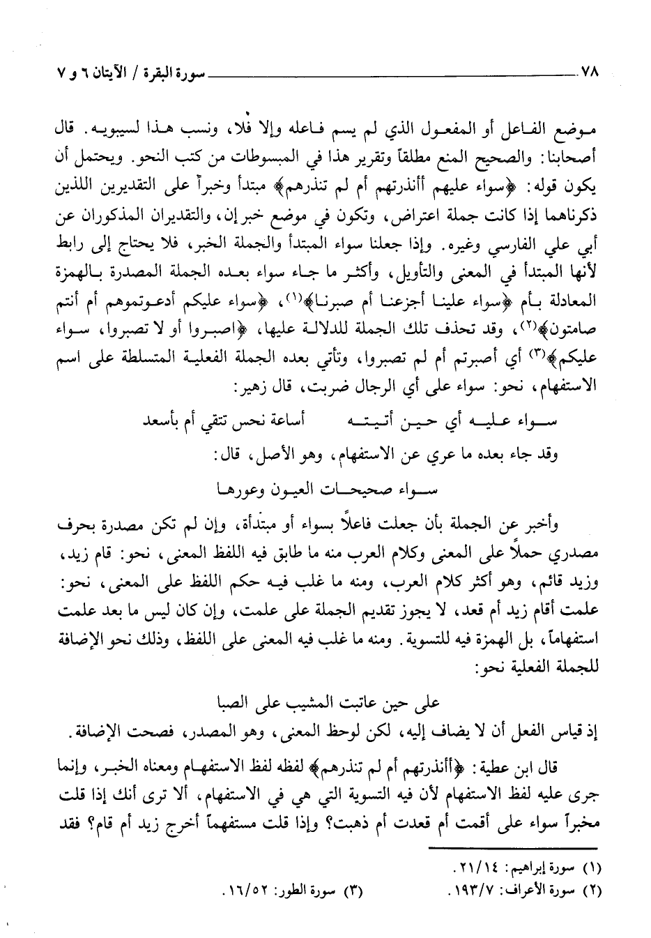 مَوْضِعِ الْفَاعِلِ أَوِ الْمَفْعُولِ الَّذِي لَمْ يُسَمَّ فَاعِلُهُ وَإِلَّا فَلَا، وَنُسِبَ هَذَا لِسِيبَوَيْهِ. قَالَ أَصْحَابُنَا: وَالصَّحِيحُ الْمَنْعُ مُطْلَقًا وَتَقْرِيرُ هَذَا فِي الْمَبْسُوطَاتِ مِنْ كُتُبِ النَّحْوِ. وَيُحْتَمَلُ أَنْ يَكُونَ قَوْلُهُ: سَواءٌ عَلَيْهِمْ أَأَنْذَرْتَهُمْ أَمْ لَمْ تُنْذِرْهُمْ مُبْتَدَأً وَخَبَرًا عَلَى التَّقْدِيرَيْنِ اللَّذَيْنِ ذَكَرْنَاهُمَا إِذَا كَانَتْ جُمْلَةَ اعْتِرَاضٍ، وَتَكُونُ فِي مَوْضِعِ خَبَرِ إِنَّ، وَالتَّقْدِيرَانِ الْمَذْكُورَانِ عَنْ أَبِي عَلِيٍّ الْفَارِسِيِّ وَغَيْرِهِ. وَإِذَا جَعَلْنَا سَوَاءً الْمُبْتَدَأَ وَالْجُمْلَةَ الْخَبَرَ، فَلَا يُحْتَاجُ إِلَى رَابِطٍ لِأَنَّهَا الْمُبْتَدَأُ فِي الْمَعْنَى وَالتَّأْوِيلِ، وَأَكْثَرُ مَا جَاءَ سَوَاءٌ بَعْدَهُ الْجُمْلَةُ الْمُصَدَّرَةُ بِالْهَمْزَةِ الْمُعَادَلَةُ بِأَمْ سَواءٌ عَلَيْنا أَجَزِعْنا أَمْ صَبَرْنا «1» ، سَواءٌ عَلَيْكُمْ أَدَعَوْتُمُوهُمْ أَمْ أَنْتُمْ صامِتُونَ «2» ، وَقَدْ تُحْذَفُ تِلْكَ الْجُمْلَةُ لِلدَّلَالَةِ عَلَيْهَا، فَاصْبِرُوا أَوْ لَا تَصْبِرُوا، سَواءٌ عَلَيْكُمْ «3» أَيْ أَصَبَرْتُمْ أَمْ لَمْ تَصْبِرُوا، وَتَأْتِي بَعْدَهُ الْجُمْلَةُ الْفِعْلِيَّةُ الْمُتَسَلِّطَةُ عَلَى اسْمِ الِاسْتِفْهَامِ، نَحْوُ: سَوَاءٌ عَلَيَّ أَيُّ الرِّجَالِ ضَرَبْتُ، قَالَ زُهَيْرٌ: