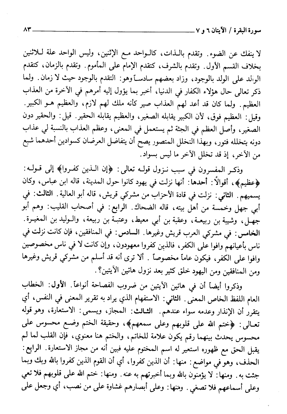وَذَكَرُوا أَيْضًا أَنَّ فِي هَاتَيْنِ الْآيَتَيْنِ مِنْ ضُرُوبِ الْفَصَاحَةِ أَنْوَاعًا. الْأَوَّلُ: الْخِطَابُ الْعَامُّ اللَّفْظِ الْخَاصُّ الْمَعْنَى. الثَّانِي: الِاسْتِفْهَامُ الَّذِي يُرَادُ بِهِ تَقْرِيرُ الْمَعْنَى فِي النَّفْسِ، أَيْ يَتَقَرَّرُ أَنَّ الْإِنْذَارَ وَعَدَمَهُ سَوَاءٌ عِنْدَهُمْ. الثَّالِثُ: الْمَجَازُ، وَيُسَمَّى: الِاسْتِعَارَةَ، وَهُوَ قَوْلُهُ تَعَالَى: خَتَمَ اللَّهُ عَلى قُلُوبِهِمْ وَعَلى سَمْعِهِمْ، وَحَقِيقَةُ الْخَتْمِ وَضْعُ مَحْسُوسٍ عَلَى مَحْسُوسٍ يَحْدُثُ بَيْنَهُمَا رَقْمٌ يَكُونُ عَلَامَةً لِلْخَاتَمِ، وَالْخَتْمُ هُنَا مَعْنَوِيٌّ، فَإِنَّ الْقَلْبَ لَمَّا لَمْ يَقْبَلِ الْحَقَّ مَعَ ظُهُورِهِ اسْتُعِيرَ لَهُ اسْمُ الْمَخْتُومِ عَلَيْهِ فَبَيَّنَ أَنَّهُ مِنْ مَجَازِ الِاسْتِعَارَةِ. الرَّابِعُ: