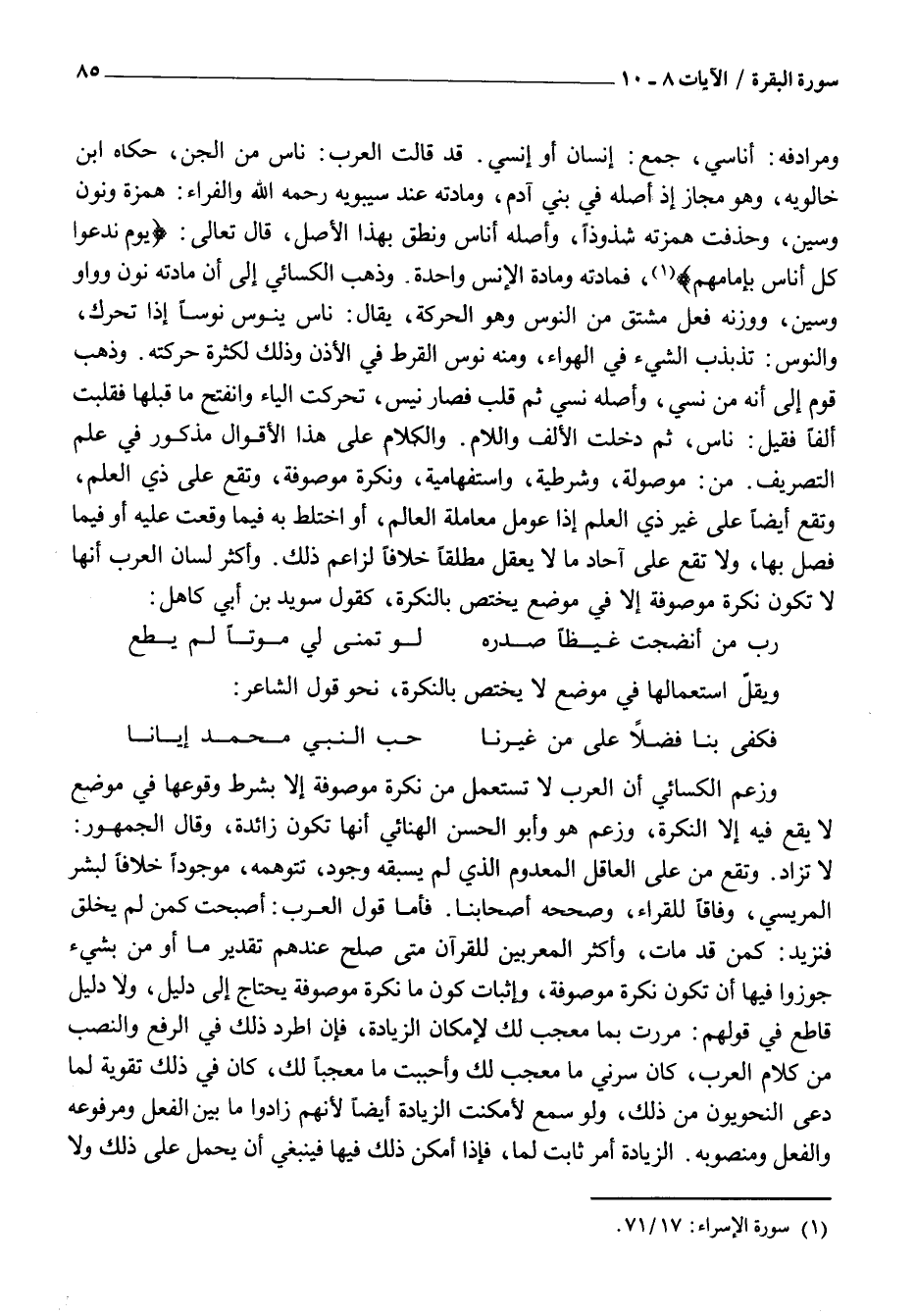 وَمُرَادِفُهُ: أَنَاسِيُّ، جَمْعُ: إِنْسَانٍ أَوْ إِنْسِيٍّ. قَدْ قَالَتِ الْعَرَبُ: نَاسٌ مِنَ الْجِنِّ، حَكَاهُ ابْنُ خَالَوَيْهِ، وَهُوَ مَجَازٌ إِذْ أَصْلُهُ فِي بَنِي آدَمَ، وَمَادَّتُهُ عِنْدَ سِيبَوَيْهِ رَحِمَهُ اللَّهُ وَالْفَرَّاءِ: هَمْزَةٌ وَنُونٌ وَسِينٌ، وَحُذِفَتْ هَمْزَتُهُ شُذُوذًا، وَأَصْلُهُ أُنَاسٌ وَنُطِقَ بِهَذَا الْأَصْلِ، قَالَ تَعَالَى: يَوْمَ نَدْعُوا كُلَّ أُناسٍ بِإِمامِهِمْ «1» ، فَمَادَّتُهُ وَمَادَّةُ الْإِنْسِ وَاحِدَةٌ. وَذَهَبَ الْكِسَائِيُّ إِلَى أَنَّ مَادَّتَهُ نُونٌ وَوَاوٌ وَسِينٌ، وَوَزْنُهُ فَعَلَ مُشْتَقٌّ مِنَ النَّوَسِ وَهُوَ الْحَرَكَةُ، يُقَالُ: نَاسَ يَنُوسُ نَوَسًا إِذَا تَحَرَّكَ، وَالنَّوَسُ: تَذَبْذُبُ الشَّيْءِ فِي الْهَوَاءِ، وَمِنْهُ نَوَسَ الْقِرْطُ فِي الْأُذُنِ وَذَلِكَ لِكَثْرَةِ حَرَكَتِهِ. وَذَهَبَ قَوْمٌ إِلَى أَنَّهُ مِنْ نَسِيَ، وَأَصْلُهُ نَسِيَ ثُمَّ قُلِبَ فَصَارَ نَيِسَ، تَحَرَّكَتِ الْيَاءُ وَانْفَتَحَ مَا قَبْلَهَا فَقُلِبَتْ أَلِفًا فَقِيلَ: نَاسٌ، ثُمَّ دَخَلَتِ الْأَلِفُ واللام. والكلام على هذا الْأَقْوَالِ مَذْكُورٌ فِي عِلْمِ التَّصْرِيفِ. مَنْ: مَوْصُولَةٌ، وَشَرْطِيَّةٌ، وَاسْتِفْهَامِيَّةٌ، وَنَكِرَةٌ مَوْصُوفَةٌ، وَتَقَعُ عَلَى ذِي الْعِلْمِ، وَتَقَعُ أَيْضًا عَلَى غَيْرِ ذِي الْعِلْمِ إِذَا عُومِلَ مُعَامَلَةَ الْعَالِمِ، أَوِ اخْتَلَطَ بِهِ فِيمَا وَقَعَتْ عَلَيْهِ أَوْ فِيمَا فُصِلَ بِهَا، وَلَا تَقَعُ عَلَى آحَادِ مَا لَا يَعْقِلُ مُطْلَقًا خِلَافًا لِزَاعِمِ ذَلِكَ. وَأَكْثَرُ لِسَانِ الْعَرَبِ أَنَّهَا لَا تَكُونُ نَكِرَةً مَوْصُوفَةً إِلَّا فِي مَوْضِعٍ يَخْتَصُّ بِالنَّكِرَةِ، كَقَوْلِ سُوَيْدِ بْنِ أَبِي كَاهِلٍ: