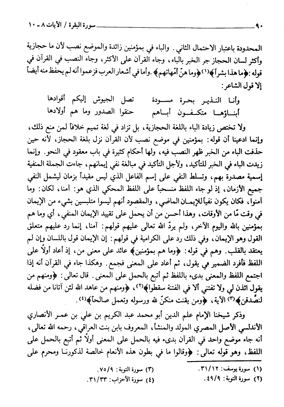 وَلَا تَخْتَصُّ زِيَادَةُ الْبَاءِ بِاللُّغَةِ الْحِجَازِيَّةِ، بَلْ تُزَادُ فِي لُغَةِ تَمِيمٍ خِلَافًا لِمَنْ مَنَعَ ذَلِكَ، وَإِنَّمَا ادَّعَيْنَا أَنَّ قَوْلَهُ: بِمُؤْمِنِينَ فِي مَوْضِعِ نَصْبٍ لِأَنَّ الْقُرْآنَ نَزَلَ بِلُغَةِ الْحِجَازِ، لِأَنَّهُ حِينَ حُذِفَتِ الْبَاءُ مِنَ الْخَبَرِ ظَهَرَ النَّصْبُ فِيهِ، وَلَهَا أَحْكَامٌ كَثِيرَةٌ فِي بَابٍ مَعْقُودٍ فِي النَّحْوِ. وَإِنَّمَا زِيدَتِ الْبَاءُ فِي الْخَبَرِ لِلتَّأْكِيدِ، وَلِأَجْلِ التَّأْكِيدِ فِي مُبَالَغَةِ نَفْيِ إِيمَانِهِمْ، جَاءَتِ الْجُمْلَةُ الْمَنْفِيَّةُ اسْمِيَّةً مُصَدَّرَةً بهم، وَتَسَلُّطُ النَّفْيِ عَلَى اسْمِ الْفَاعِلِ الَّذِي لَيْسَ مُقَيَّدًا بِزَمَانٍ لِيَشْمَلَ النَّفْيُ جَمِيعَ الْأَزْمَانِ، إِذْ لَوْ جَاءَ اللَّفْظُ مُنْسَحِبًا عَلَى اللَّفْظِ الْمَحْكِيِّ الَّذِي هُوَ: آمَنَّا، لَكَانَ: وَمَا آمَنُوا، فَكَانَ يَكُونُ نَفْيًا لِلْإِيمَانِ الْمَاضِي، وَالْمَقْصُودُ أَنَّهُمْ لَيْسُوا مُتَلَبِّسِينَ بِشَيْءٍ مِنَ الْإِيمَانِ فِي وَقْتٍ مَا مِنَ الْأَوْقَاتِ، وَهَذَا أَحْسَنُ مِنْ أَنْ يُحْمَلَ عَلَى تَقْيِيدِ الْإِيمَانِ الْمَنْفِيِّ، أَيْ وَمَا هُمْ بِمُؤْمِنِينَ بِاللَّهِ وَالْيَوْمِ الْآخِرِ، وَلَمْ يَرُدَّ اللَّهُ تَعَالَى عَلَيْهِمْ قَوْلَهُمْ: آمَنَّا، إِنَّمَا رَدَّ عَلَيْهِمْ مُتَعَلِّقَ الْقَوْلِ وَهُوَ الْإِيمَانُ، وَفِي ذَلِكَ رَدٌّ عَلَى الْكَرَّامِيَّةِ فِي قَوْلِهِمْ: إِنَّ الْإِيمَانَ قَوْلٌ بِاللِّسَانِ وَإِنْ لَمْ يُعْتَقَدْ بِالْقَلْبِ. وَهُمْ فِي قَوْلِهِ: وَما هُمْ بِمُؤْمِنِينَ عَائِدٌ عَلَى مَعْنَى مَنْ، إذ أَعَادَ أَوَّلًا عَلَى اللَّفْظِ فَأَفْرَدَ الضَّمِيرَ فِي يَقُولُ، ثُمَّ أَعَادَ عَلَى الْمَعْنَى فَجَمَعَ. وَهَكَذَا جَاءَ فِي الْقُرْآنِ أَنَّهُ إِذَا اجْتَمَعَ اللفظ والمعنى بدىء بِاللَّفْظِ ثُمَّ أُتْبِعَ بِالْحَمْلِ عَلَى الْمَعْنَى. قَالَ تَعَالَى: وَمِنْهُمْ مَنْ يَقُولُ ائْذَنْ لِي وَلا تَفْتِنِّي أَلا فِي الْفِتْنَةِ سَقَطُوا «2» ، وَمِنْهُمْ مَنْ عاهَدَ اللَّهَ لَئِنْ آتَانَا مِنْ فَضْلِهِ لَنَصَّدَّقَنَّ «3» الْآيَةَ، وَمَنْ يَقْنُتْ مِنْكُنَّ لِلَّهِ وَرَسُولِهِ وَتَعْمَلْ صالِحاً «4» .