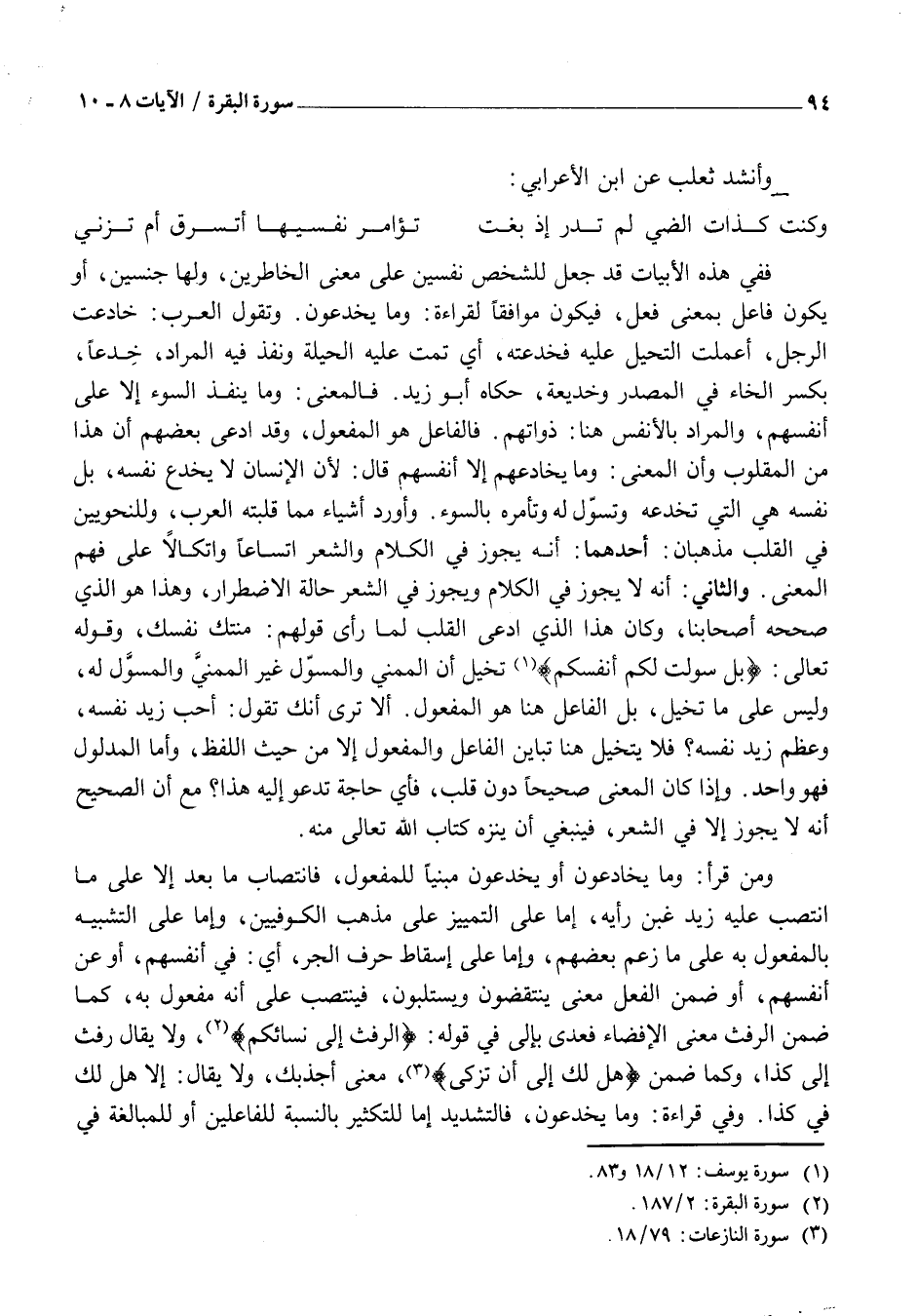 فَفِي هَذِهِ الْأَبْيَاتِ قَدْ جُعِلَ لِلشَّخْصِ نَفْسَيْنِ عَلَى مَعْنَى الْخَاطِرَيْنِ، وَلَهَا جِنْسَيْنِ، أَوْ يَكُونُ فَاعَلُ بِمَعْنَى فَعَلَ، فَيَكُونُ مُوَافِقًا لِقِرَاءَةِ: وَمَا يَخْدَعُونَ. وَتَقُولُ الْعَرَبُ: خَادَعْتُ الرَّجُلَ، أَعْمَلْتُ التَّحَيُّلَ عَلَيْهِ فَخَدَعْتُهُ، أَيْ تَمَّتْ عَلَيْهِ الْحِيلَةُ وَنَفَذَ فِيهِ الْمُرَادُ، خِدَعًا، بِكَسْرِ الْخَاءِ فِي الْمَصْدَرِ وَخَدِيعَةً، حَكَاهُ أَبُو زَيْدٍ. فَالْمَعْنَى: وَمَا يَنْفُذُ السُّوءُ إِلَّا عَلَى أَنْفُسِهِمْ، وَالْمُرَادُ بِالْأَنْفُسِ هُنَا: ذَوَاتِهِمْ. فَالْفَاعِلُ هُوَ الْمَفْعُولُ، وَقَدِ ادَّعَى بَعْضُهُمْ أَنَّ هَذَا مِنَ الْمَقْلُوبِ وَأَنَّ الْمَعْنَى: وَمَا يُخَادِعُهُمْ إِلَّا أَنْفُسُهُمْ قَالَ: لِأَنَّ الْإِنْسَانَ لَا يَخْدَعُ نَفْسَهُ، بَلْ نَفْسُهُ هِيَ الَّتِي تَخْدَعُهُ وَتُسَوِّلُ لَهُ وَتَأْمُرُهُ بِالسُّوءِ. وَأَوْرَدَ أَشْيَاءً مِمَّا قَلَبَتْهُ الْعَرَبُ، وَلِلنَّحْوِيِّينَ فِي الْقَلْبِ مَذْهَبَانِ: أَحَدُهُمَا: أَنَّهُ يَجُوزُ فِي الْكَلَامِ وَالشِّعْرِ اتِّسَاعًا وَاتِّكَالًا عَلَى فَهْمِ الْمَعْنَى. وَالثَّانِي: أَنَّهُ لَا يَجُوزُ فِي الْكَلَامِ وَيَجُوزُ فِي الشِّعْرِ حَالَةَ الِاضْطِرَارِ، وَهَذَا هُوَ الَّذِي صَحَّحَهُ أَصْحَابُنَا، وَكَانَ هَذَا الَّذِي ادَّعَى الْقَلْبَ لَمَّا رَأَى قَوْلَهُمْ: مَنَّتْكَ نَفْسُكَ، وَقَوْلُهُ تَعَالَى: بَلْ سَوَّلَتْ لَكُمْ أَنْفُسُكُمْ «1» تَخَيَّلَ أَنَّ الْمُمَنِّيَ وَالْمُسَوِّلَ غَيْرُ الْمُمَنَّى وَالْمُسَوَّلِ لَهُ، وَلَيْسَ عَلَى مَا تَخَيَّلَ، بَلِ الْفَاعِلُ هُنَا هُوَ الْمَفْعُولُ. أَلَا تَرَى أَنَّكَ تَقُولُ: أَحَبَّ زَيْدٌ نَفْسَهُ، وَعَظَّمَ زَيْدٌ نَفْسَهُ؟ فَلَا يُتَخَيَّلُ هُنَا تَبَايُنُ الْفَاعِلِ وَالْمَفْعُولِ إِلَّا مِنْ حَيْثُ اللَّفْظِ، وَأَمَّا الْمَدْلُولُ فَهُوَ وَاحِدٌ. وَإِذَا كَانَ الْمَعْنَى صَحِيحًا دُونَ قَلْبٍ، فَأَيُّ حَاجَةٍ تَدْعُو إِلَيْهِ هَذَا؟ مَعَ أَنَّ الصَّحِيحَ أَنَّهُ لَا يَجُوزُ إِلَّا فِي الشِّعْرِ، فَيَنْبَغِي أَنْ يُنَزَّهَ كِتَابُ اللَّهِ تَعَالَى مِنْهُ.