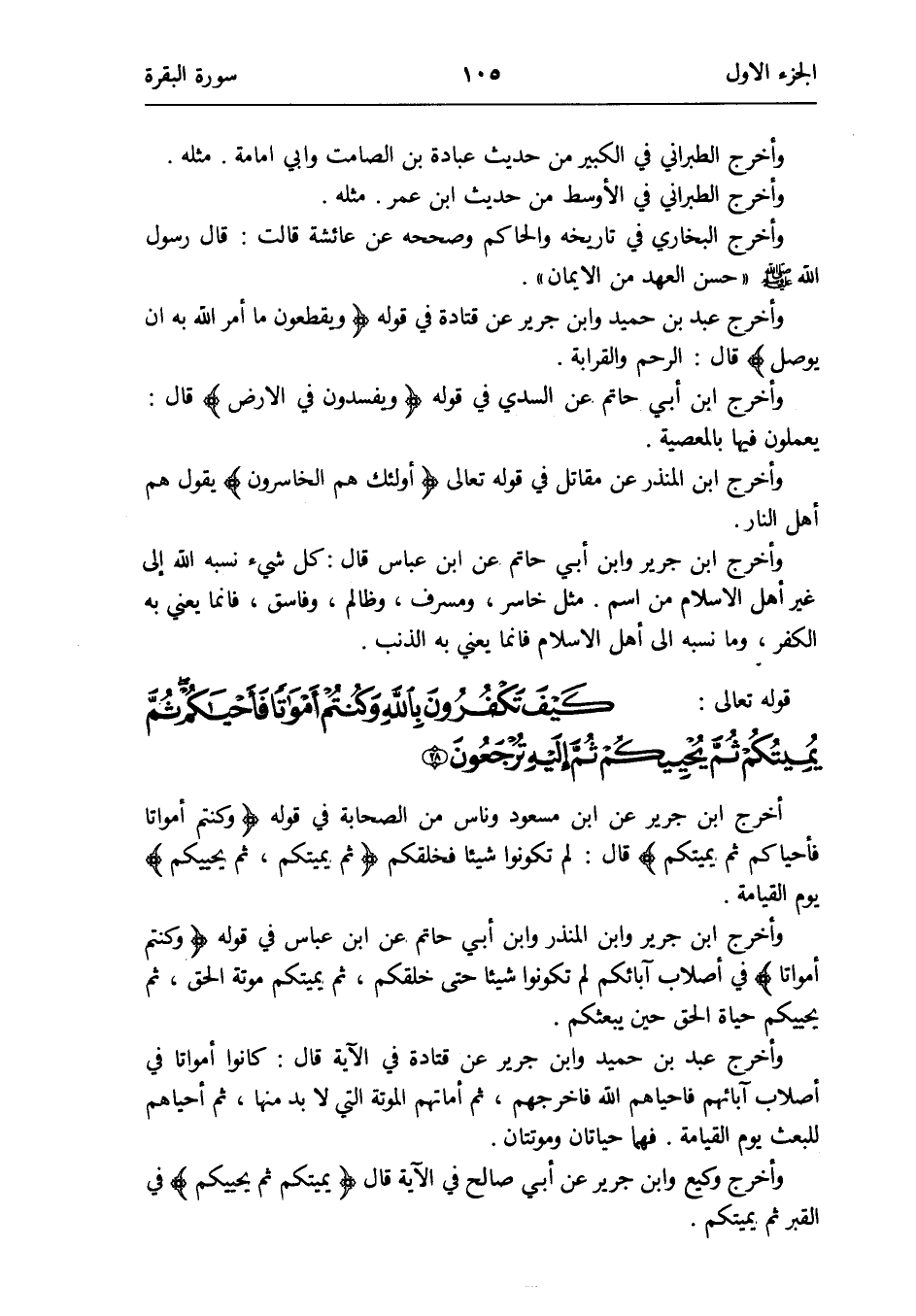 أخرج ابْن جرير عَن ابْن مَسْعُود وناس من الصَّحَابَة فِي قَوْله {وكنتم أَمْوَاتًا فأحياكم ثمَّ يميتكم} قَالَ: لم تَكُونُوا شَيْئا فخلفكم {ثمَّ يميتكم ثمَّ يُحْيِيكُمْ} يَوْم الْقِيَامَة