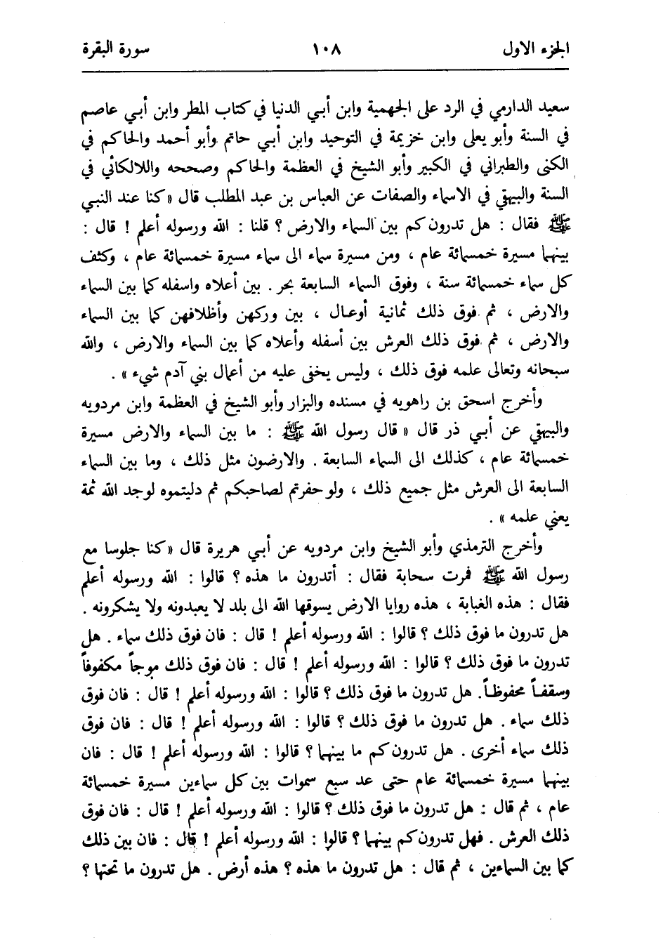 سعيد الدَّارمِيّ فِي الرَّد على الْجَهْمِية وَابْن أبي الدُّنْيَا فِي كتاب الْمَطَر وَابْن أبي عَاصِم فِي السّنة وَأَبُو يعلى وَابْن خُزَيْمَة فِي التَّوْحِيد وَابْن أبي حَاتِم وَأَبُو أَحْمد وَالْحَاكِم فِي الكنى وَالطَّبَرَانِيّ فِي الْكَبِير وَأَبُو الشَّيْخ فِي العظمة وَالْحَاكِم وَصَححهُ واللالكائي فِي السّنة وَالْبَيْهَقِيّ فِي الْأَسْمَاء وَالصِّفَات عَن الْعَبَّاس بن عبد الْمطلب قَالَ كُنَّا عِنْد النَّبِي صلى الله عَلَيْهِ وَسلم فَقَالَ: هَل تَدْرُونَ كم بَين السَّمَاء وَالْأَرْض قُلْنَا: الله وَرَسُوله أعلم قَالَ: بَينهمَا مسيرَة خَمْسمِائَة عَام وَمن مسيرَة سَمَاء إِلَى سَمَاء مسيرَة خَمْسمِائَة عَام وكثف كل سَمَاء خَمْسمِائَة سنة وَفَوق السَّمَاء السَّابِعَة بَحر