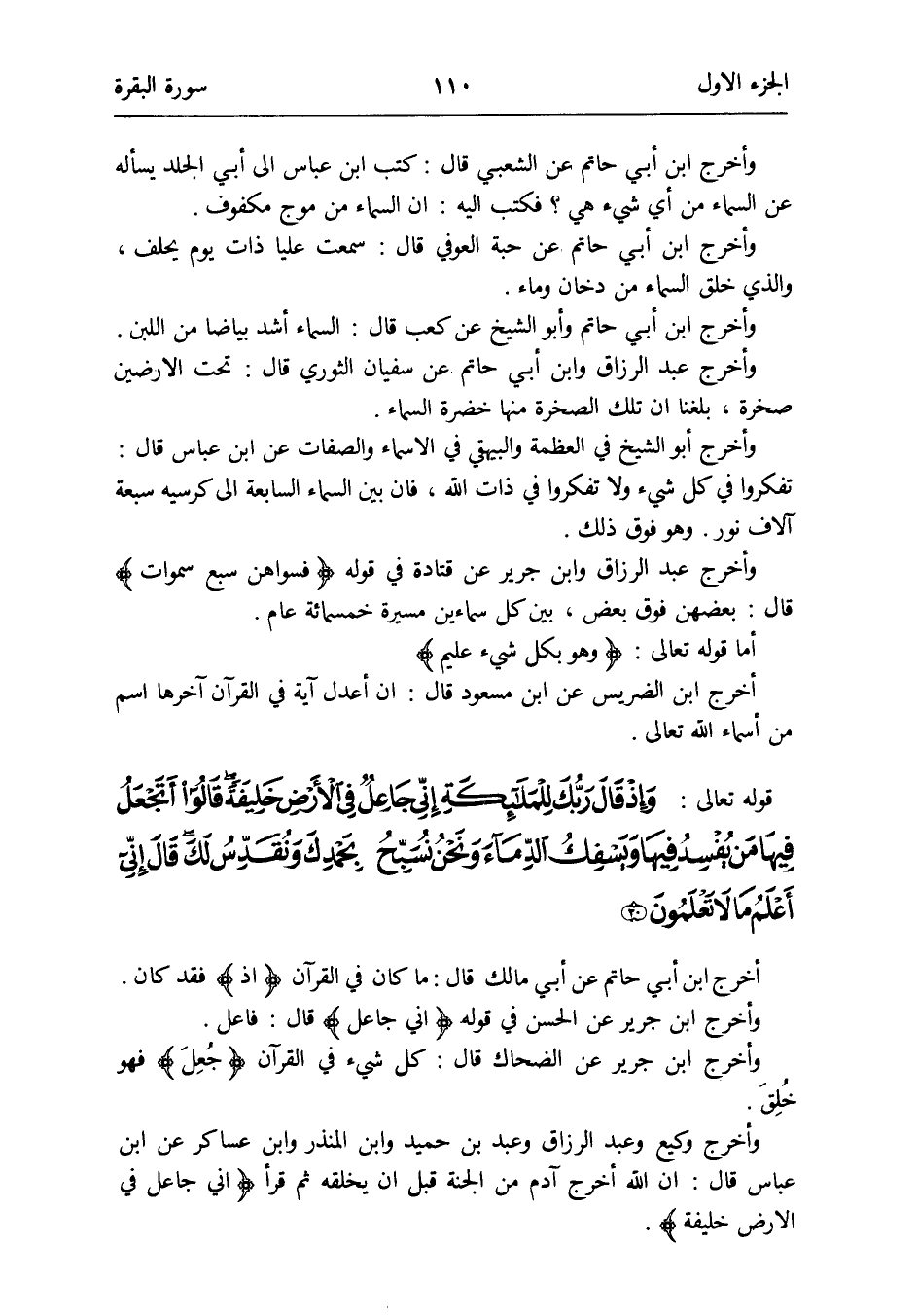 وَأخرج ابْن أبي حَاتِم عَن الشّعبِيّ قَالَ: كتب ابْن عَبَّاس إِلَى أبي الْجلد يسْأَله عَن السَّمَاء من أَي شَيْء هِيَ فَكتب إِلَيْهِ: إِن السَّمَاء من موج مكفوف