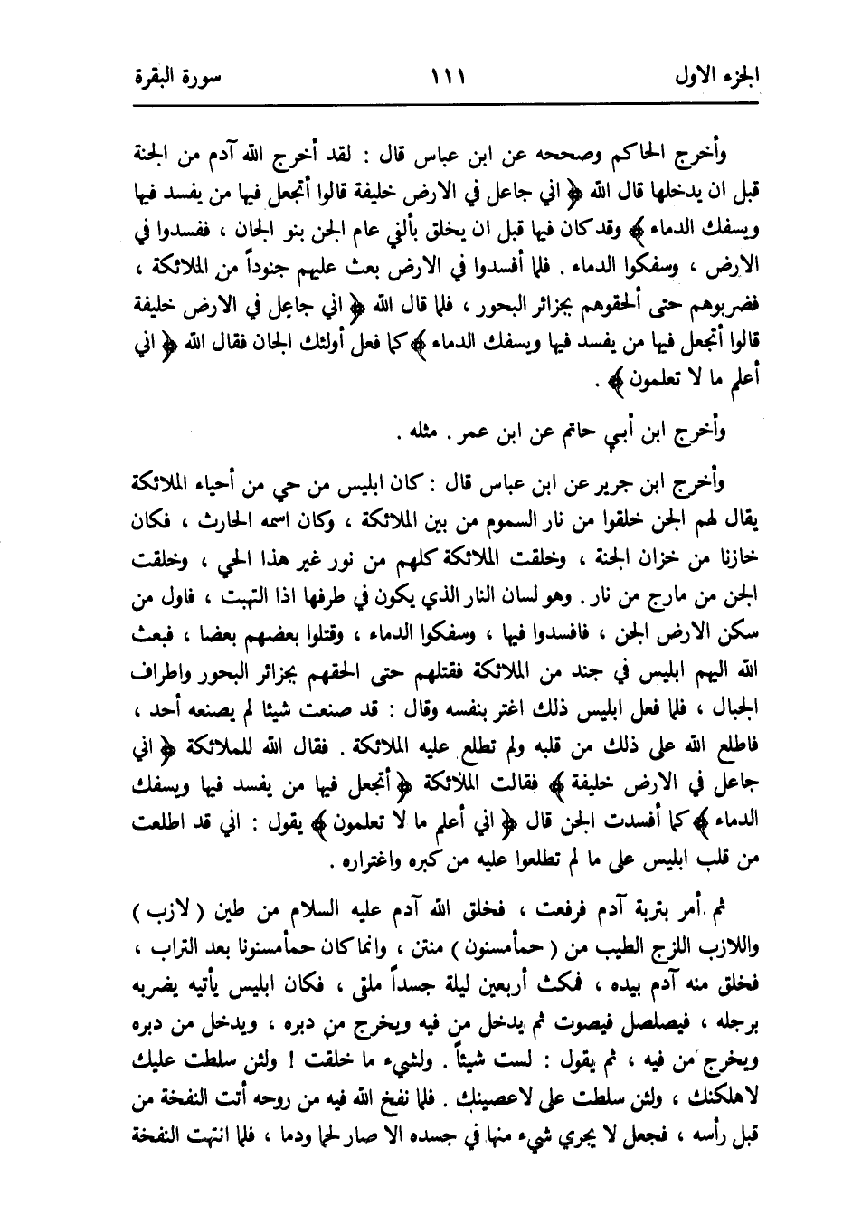 فَلَمَّا أفسدوا فِي الأَرْض بعث عَلَيْهِم جُنُودا من الْمَلَائِكَة فضربوهم حَتَّى ألحقوهم بجزائر البحور فَلَمَّا قَالَ الله {وَإِذ قَالَ رَبك للْمَلَائكَة إِنِّي جَاعل فِي الأَرْض خَليفَة قَالُوا أَتجْعَلُ فِيهَا من يفْسد فِيهَا ويسفك الدِّمَاء} كَمَا فعل أُولَئِكَ الجان فَقَالَ الله {إِنِّي أعلم مَا لَا تعلمُونَ}