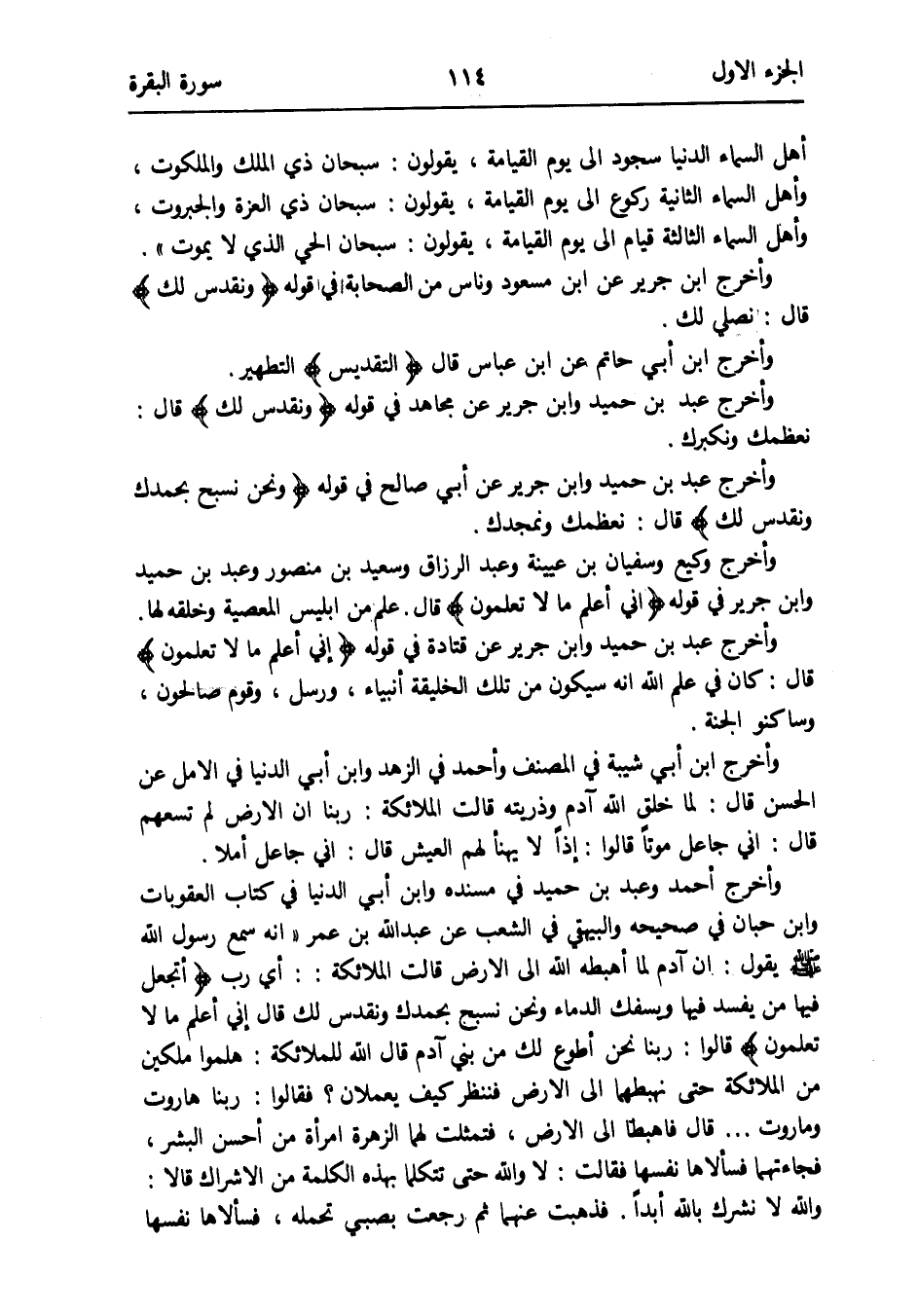 وَأخرج عبد بن حميد وَابْن جرير عَن أبي صَالح فِي قَوْله {وَنحن نُسَبِّح بحَمْدك ونقدس لَك} قَالَ: نعظمك ونمجدك