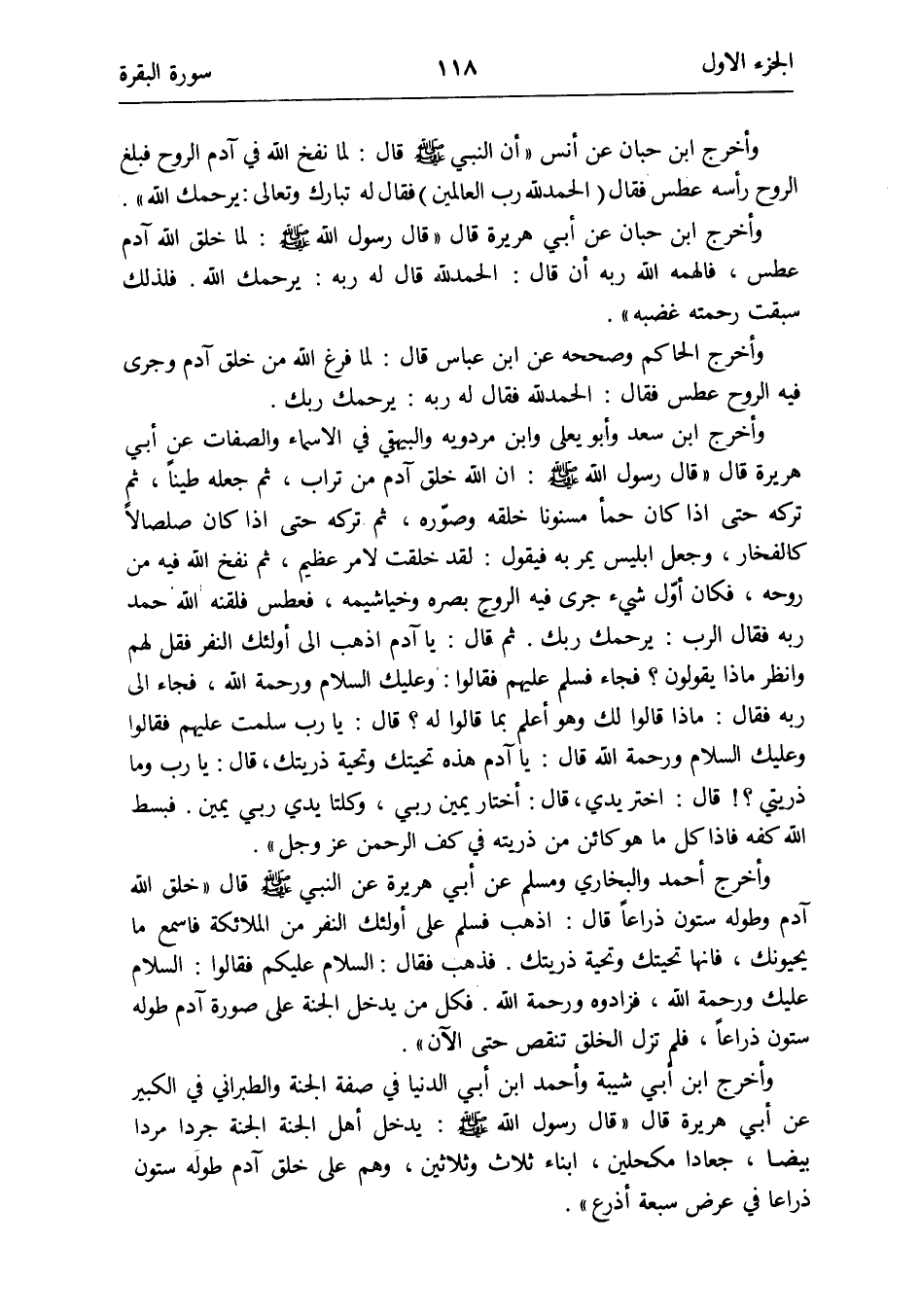 وَأخرج أَحْمد وَالْبُخَارِيّ وَمُسلم عَن أبي هُرَيْرَة عَن النَّبِي صلى الله عَلَيْهِ وَسلم قَالَ خلق الله آدم وَطوله سِتُّونَ ذِرَاعا قَالَ: اذْهَبْ فَسلم على أُولَئِكَ النَّفر من الْمَلَائِكَة فاسمع مَا يحيونك فَإِنَّهَا تحيتك وتحية ذريتك