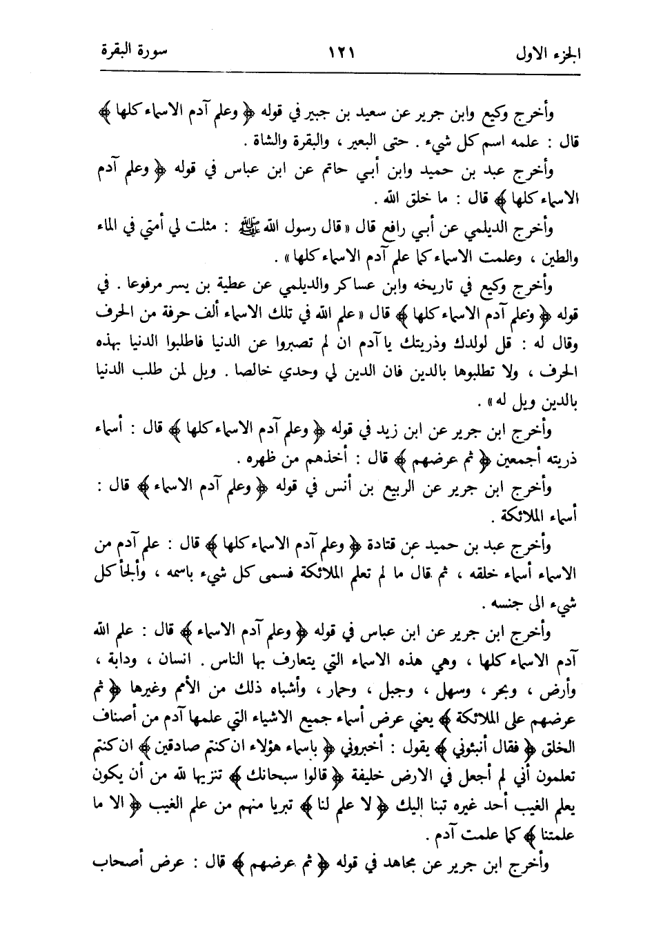 وَأخرج ابْن جرير عَن ابْن عَبَّاس فِي قَوْله {وَعلم آدم الْأَسْمَاء كلهَا} قَالَ: علم الله آدم الْأَسْمَاء كلهَا وَهِي هَذِه الْأَسْمَاء الَّتِي يتعارف بهَا النَّاس