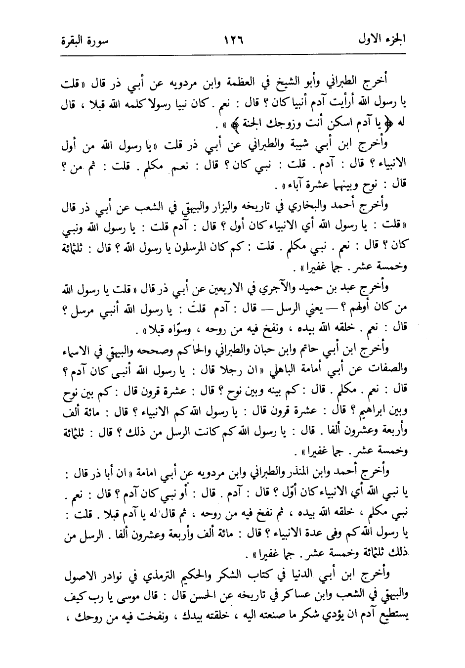 وَأخرج أَحْمد وَابْن الْمُنْذر وَالطَّبَرَانِيّ وَابْن مرْدَوَيْه عَن أبي أُمَامَة أَن أَبَا ذَر قَالَ: يَا نَبِي الله أَي الْأَنْبِيَاء كَانَ أول قَالَ: آدم