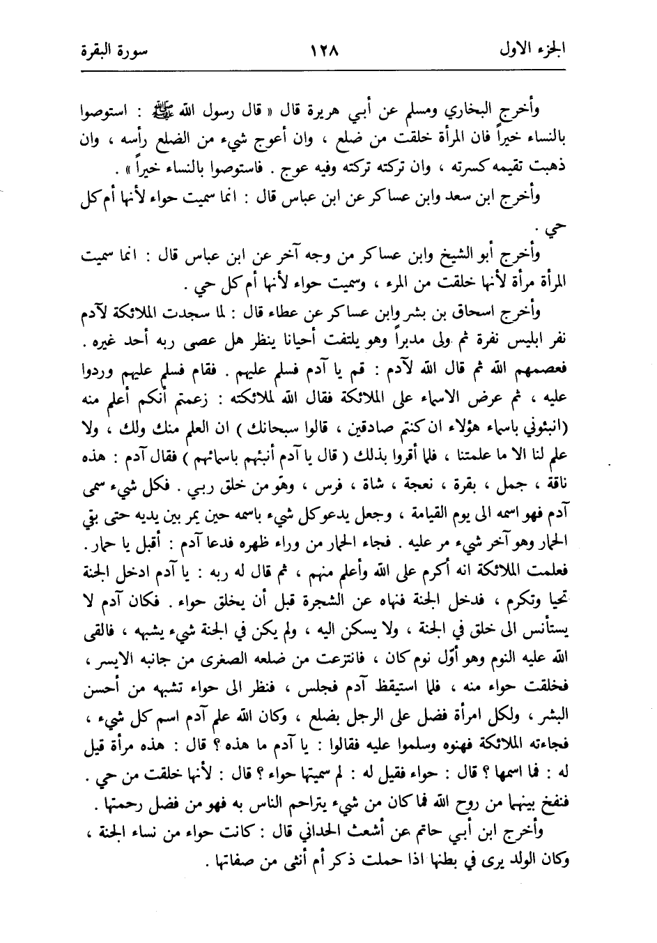 وَأخرج البُخَارِيّ وَمُسلم عَن أبي هُرَيْرَة قَالَ قَالَ رَسُول الله صلى الله عَلَيْهِ وَسلم: اسْتَوْصُوا بِالنسَاء خيرا فَإِن الْمَرْأَة خلقت من ضلع وَأَن أَعْوَج شَيْء من الضلع رَأسه وَإِن ذهبت تُقِيمهُ كَسرته وَإِن تركته تركته وَفِيه عوج