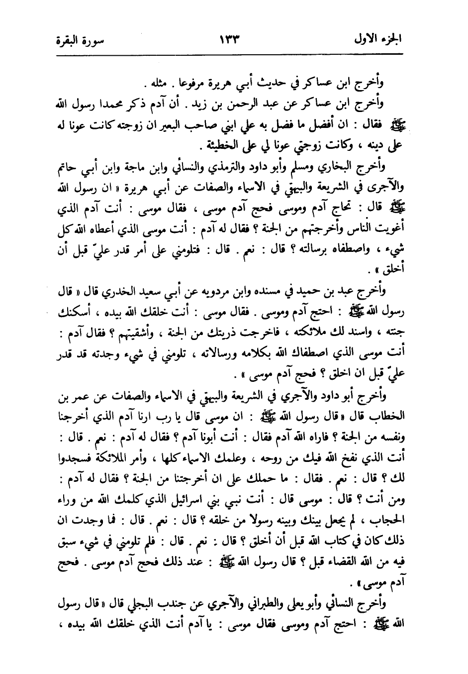 وَأخرج البُخَارِيّ وَمُسلم وَأَبُو دَاوُد وَالتِّرْمِذِيّ وَالنَّسَائِيّ وَابْن ماجة وَابْن أبي حَاتِم والآجري فِي الشَّرِيعَة وَالْبَيْهَقِيّ فِي الْأَسْمَاء وَالصِّفَات عَن أبي هُرَيْرَة أَن رَسُول الله صلى الله عَلَيْهِ وَسلم قَالَ: تحاج آدم ومُوسَى فحج آدم مُوسَى فَقَالَ مُوسَى: أَنْت آدم الَّذِي أغويت النَّاس وأخرجتهم من الْجنَّة فَقَالَ لَهُ آدم: أَنْت مُوسَى الَّذِي أعطَاهُ الله كل شَيْء واصطفاه برسالته قَالَ: نعم