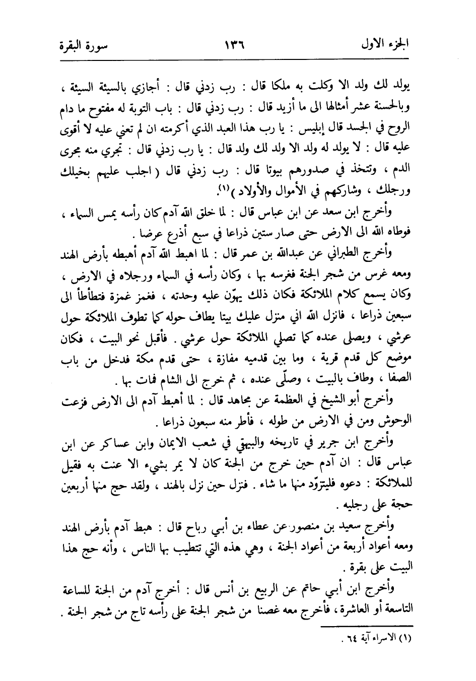 يُولد لَك ولد إِلَّا وكلت بِهِ ملكا قَالَ: رب زِدْنِي قَالَ: أجازي السَّيئَة بِالسَّيِّئَةِ وبالحسنة عشرَة أَمْثَالهَا إِلَى مَا أَزِيد قَالَ: رب زِدْنِي قَالَ: بَاب التَّوْبَة لَهُ مَفْتُوح مَا دَامَ الرّوح فِي الْجَسَد قَالَ إِبْلِيس: يَا رب هَذَا العَبْد الَّذِي أكرمته إِن لم تَعْنِي عَلَيْهِ لَا أقوى عَلَيْهِ قَالَ: لَا يُولد لَهُ ولد إِلَّا ولد لَك ولد قَالَ: يَا رب زِدْنِي قَالَ: تجْرِي مِنْهُ مجْرى الدَّم وتتخذ فِي صدروهم بُيُوتًا قَالَ: رب زِدْنِي قَالَ (اجلب عَلَيْهِم بخيلك ورجلك وشاركهم فِي الْأَمْوَال وَالْأَوْلَاد) (الْإِسْرَاء آيَة 64)