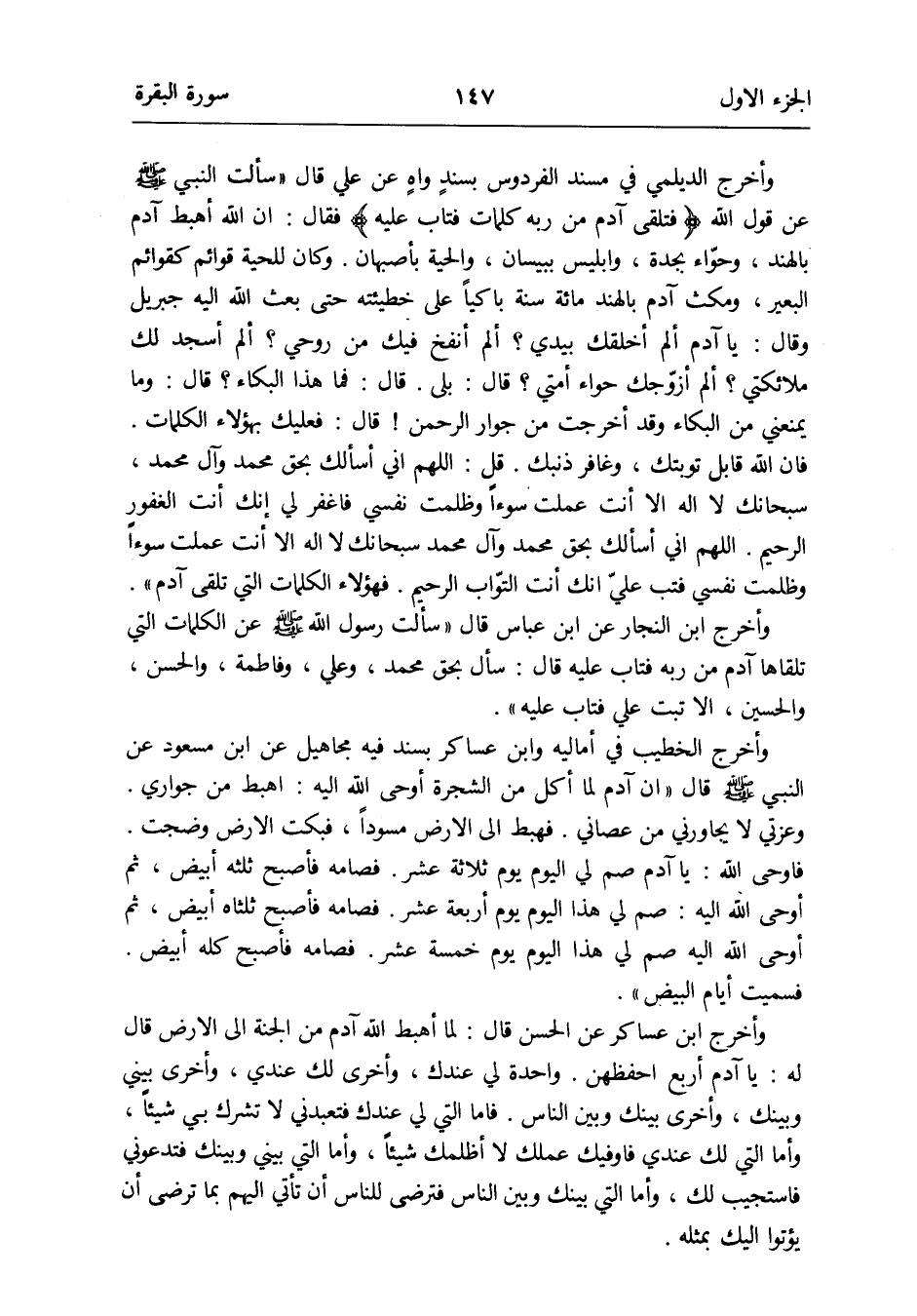 وَأخرج ابْن النجار عَن ابْن عَبَّاس قَالَ سَأَلت رَسُول الله صلى الله عَلَيْهِ وَسلم عَن الْكَلِمَات الَّتِي تلقاها آدم من ربه فَتَابَ عَلَيْهِ قَالَ: سَأَلَ بِحَق مُحَمَّد وَعلي وَفَاطِمَة وَالْحسن وَالْحُسَيْن إِلَّا تبت عَليّ فَتَابَ عَلَيْهِ