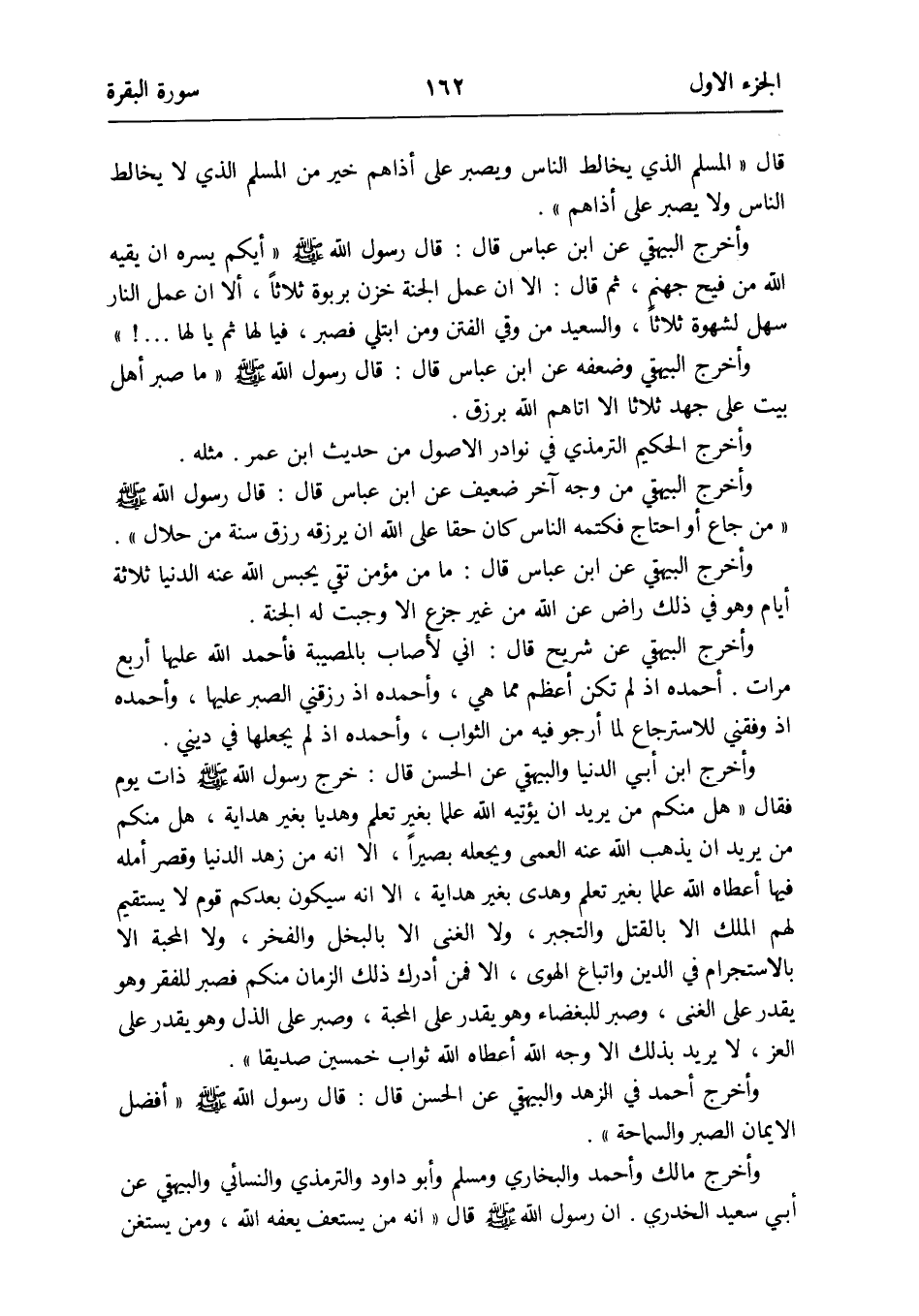 وَأخرج الْبَيْهَقِيّ عَن ابْن عَبَّاس قَالَ: مَا من مُؤمن تَقِيّ يحبس الله عَنهُ الدُّنْيَا ثَلَاثَة أَيَّام وَهُوَ فِي ذَلِك رَاض عَن الله من غير جزع إِلَّا وَجَبت لَهُ الْجنَّة