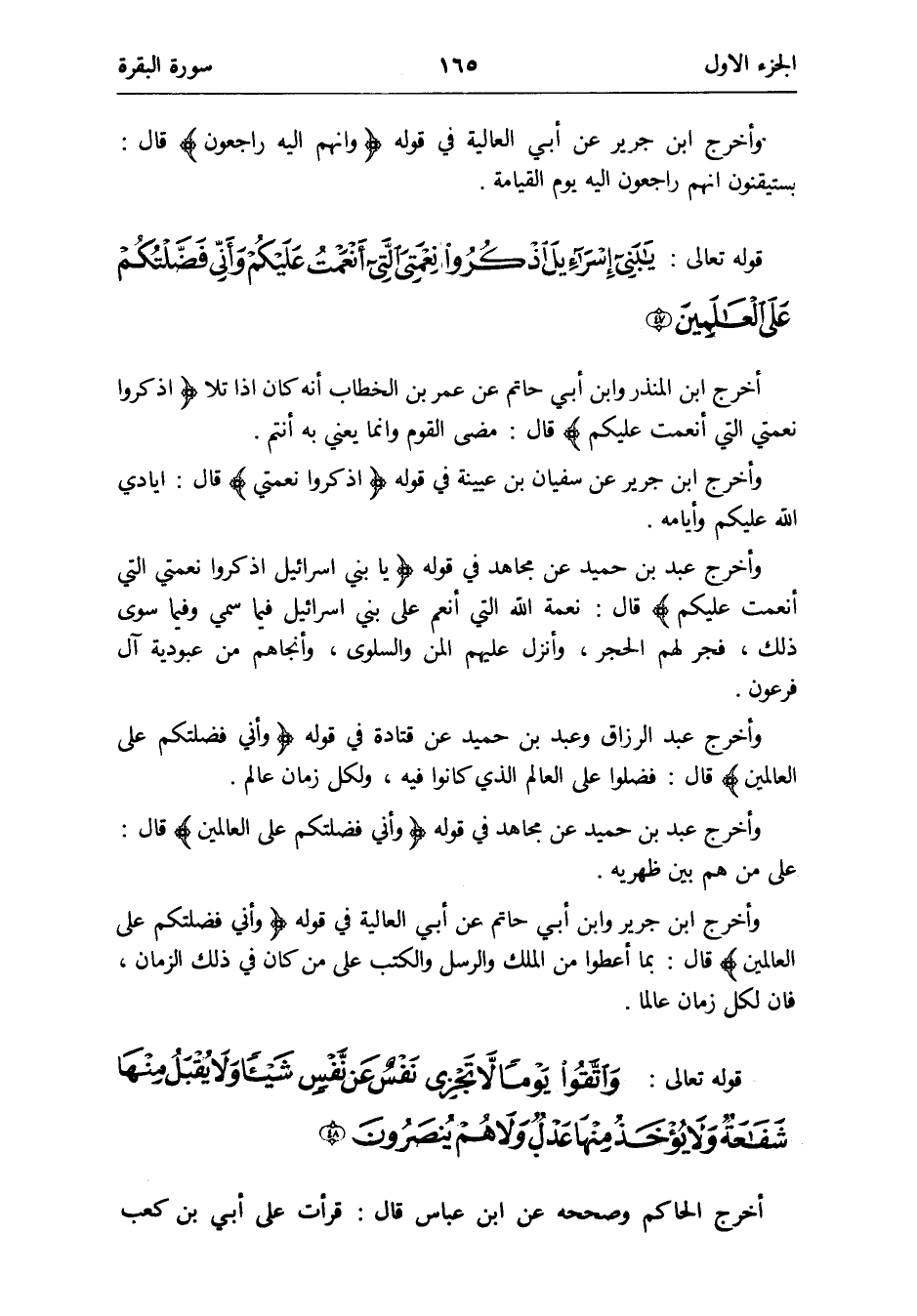 وَأخرج عبد بن حميد عَن مُجَاهِد فِي قَوْله {يَا بني إِسْرَائِيل اذْكروا نعمتي الَّتِي أَنْعَمت عَلَيْكُم} قَالَ: نعْمَة الله الَّتِي أنعم على بني إِسْرَائِيل فِيمَا سمي وَفِيمَا سوى ذَلِك فجر لَهُم الْحجر وَأنزل عَلَيْهِم الْمَنّ والسلوى وأنجاهم من عبودية آل فِرْعَوْن
