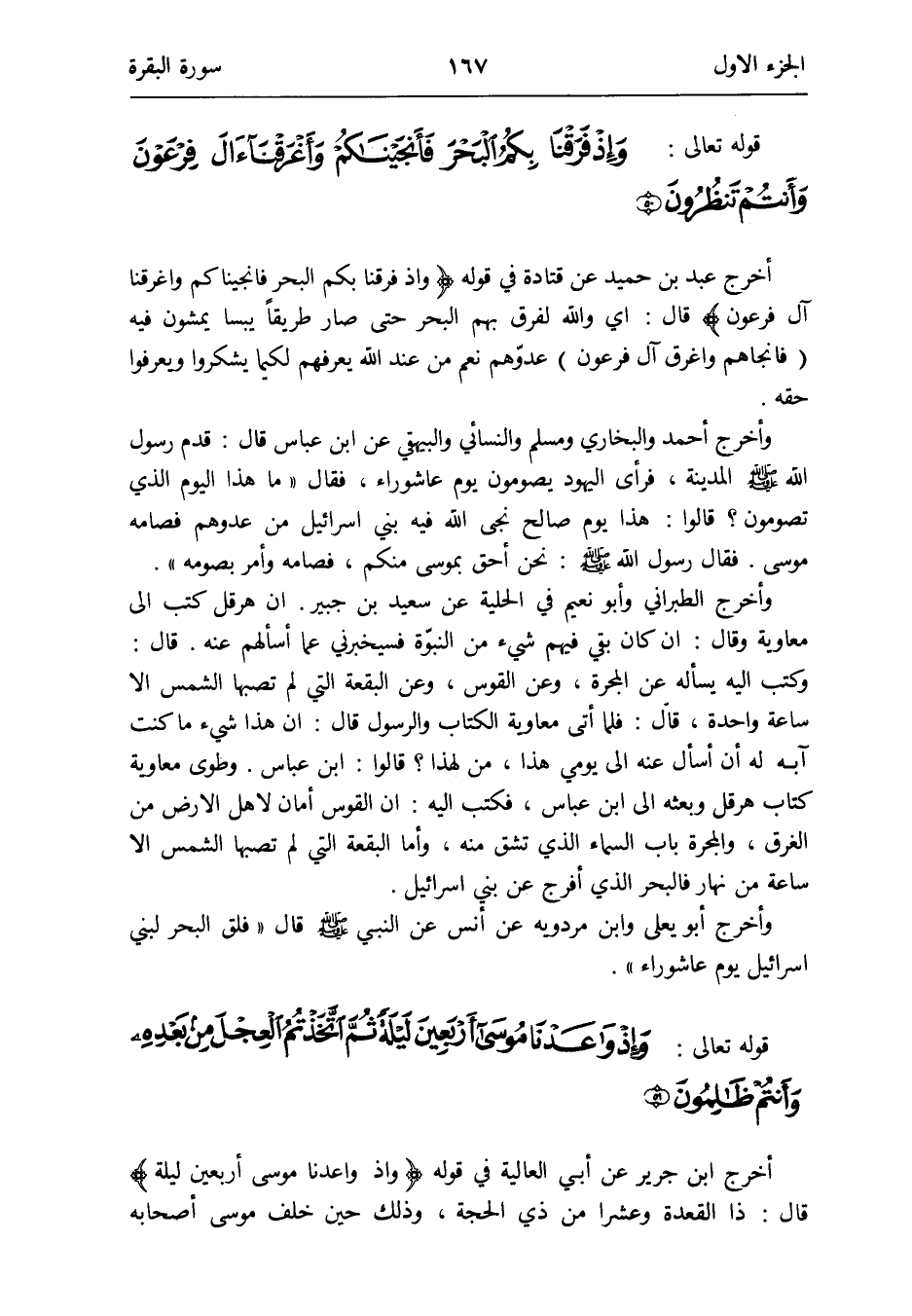 أخرج عبد بن حميد عَن قَتَادَة فِي قَوْله {وَإِذ فرقنا بكم الْبَحْر فأنجيناكم وأغرقنا آل فِرْعَوْن وَأَنْتُم تنْظرُون} قَالَ: أَي وَالله لفرق بهم الْبَحْر حَتَّى صَار طَرِيقا يبساً يَمْشُونَ فِيهِ (فأنجاهم وَأغْرقَ آل فِرْعَوْن) عدوهم نعم من عِنْد الله يعرفهُمْ لكيما يشكروا ويعرفوا حَقه