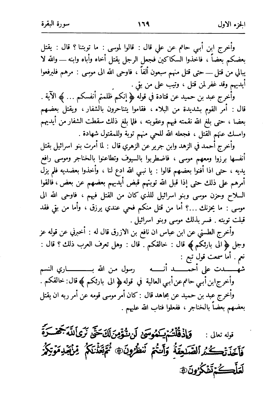 وَأخرج أَحْمد فِي الزّهْد وَابْن جرير عَن الزُّهْرِيّ قَالَ: لما أمرت بَنو إسرائي بقتل أَنْفسهَا برزوا وَمَعَهُمْ مُوسَى فاضطربوا بِالسُّيُوفِ وتطاعنوا بالخناجر ومُوسَى رَافع يَدَيْهِ حَتَّى إِذا أفنوا بَعضهم قَالُوا: يَا نَبِي الله ادْع لنا وَأخذُوا بعضديه فَلم يزل أَمرهم على ذَلِك حَتَّى إِذا قبل الله تَوْبَتهمْ قبض أَيْديهم بَعضهم عَن بعض فَألْقوا السِّلَاح وحزن مُوسَى وَبَنُو إِسْرَائِيل للَّذي كَانَ من الْقَتْل فيهم فَأوحى الله إِلَى مُوسَى: مَا يحزنك