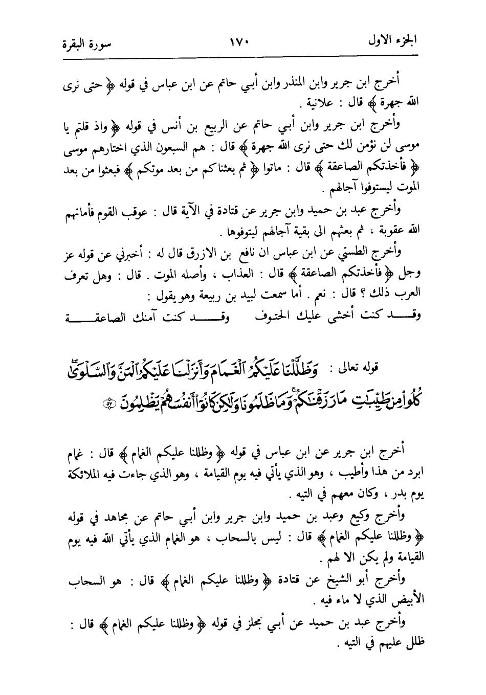 وَأخرج ابْن جرير وَابْن أبي حَاتِم عَن الرّبيع بن أنس فِي قَوْله {وَإِذ قُلْتُمْ يَا مُوسَى لن نؤمن لَك حَتَّى نرى الله جهرة} قَالَ: هم السبعون الَّذِي اخْتَارَهُمْ مُوسَى {فأخذتكم الصاعقة} قَالَ: مَاتُوا {ثمَّ بعثناكم من بعد موتكم} فبعثوا من بعد الْمَوْت ليستوفوا آجالهم