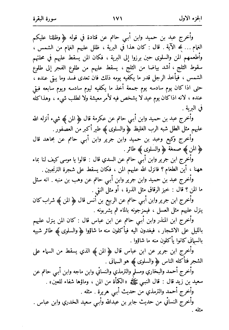 وَأخرج ابْن جرير عَن ابْن عَبَّاس قَالَ: {الْمَنّ} الَّذِي يسْقط من السَّمَاء على الشّجر فتأكله النَّاس {والسلوى} هُوَ السماني