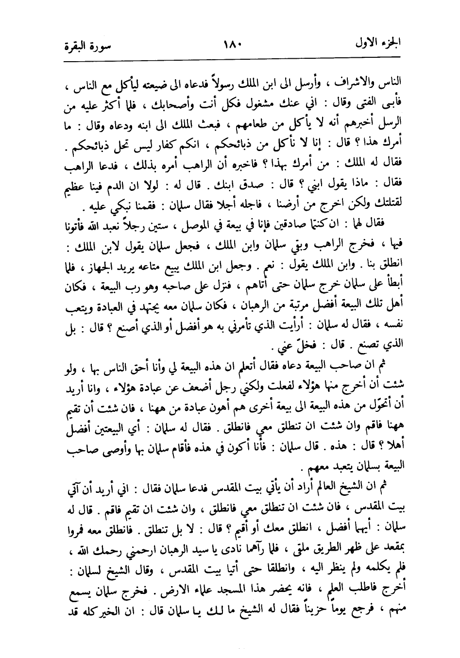 النَّاس والأشراف وَأرْسل إِلَى ابْن الْملك رَسُولا فَدَعَاهُ إِلَى ضيعته ليَأْكُل مَعَ النَّاس فَأبى الْفَتى وَقَالَ: إِنِّي عَنْك مَشْغُول فَكل أَنْت وَأَصْحَابك فَلَمَّا أَكثر عَلَيْهِ من الرُّسُل أخْبرهُم أَنه لَا يَأْكُل من طعامهم فَبعث الْملك إِلَى ابْنه وَدعَاهُ وَقَالَ: مَا أَمرك هَذَا قَالَ: إِنَّا لَا نَأْكُل من ذبائحكم إِنَّكُم كفار لَيْسَ تحل ذبائحكم