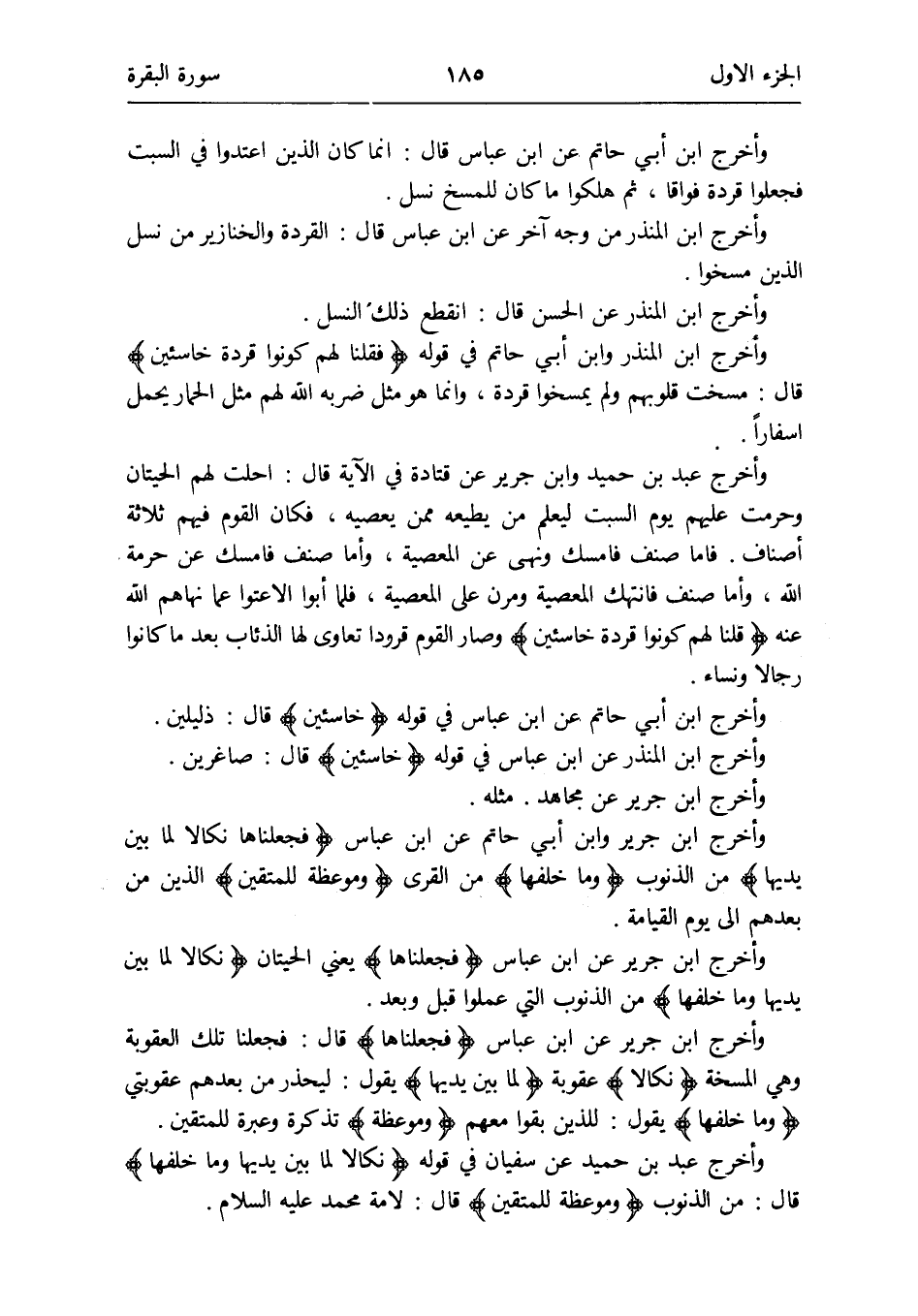وَأخرج ابْن الْمُنْذر وَابْن أبي حَاتِم فِي قَوْله {فَقُلْنَا لَهُم كونُوا قردة خَاسِئِينَ} قَالَ: مسخت قُلُوبهم وَلم يمخوا قردة وَإِنَّمَا هُوَ مثل ضربه الله لَهُم مثل الْحمار يحمل أسفاراً