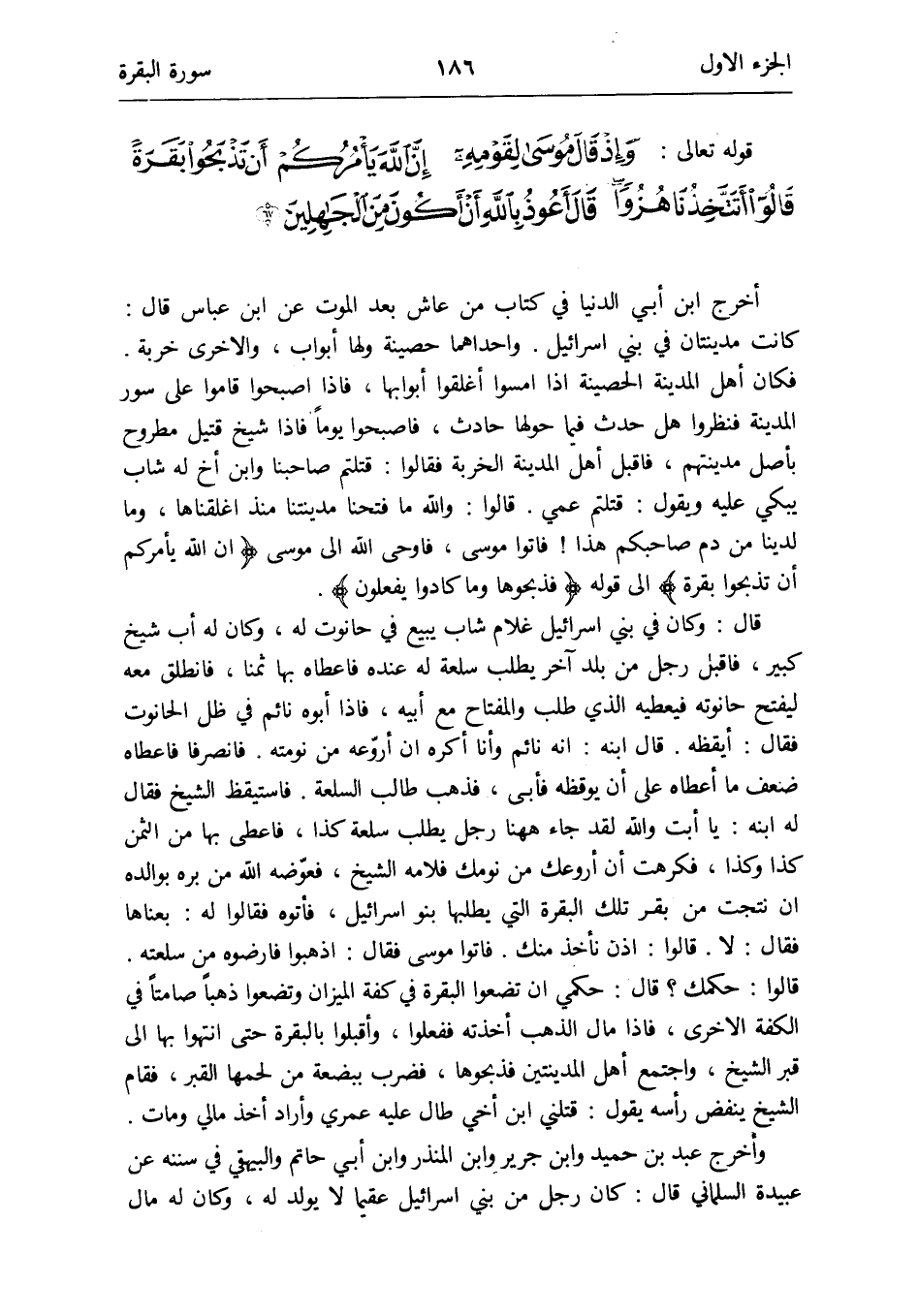 فَاسْتَيْقَظَ الشَّيْخ فَقَالَ لَهُ ابْنه: يَا أَبَت وَالله لقد جَاءَ هَهُنَا رجل يطْلب سلْعَة كَذَا فَأعْطى بهَا من الثّمن كَذَا وَكَذَا فَكرِهت أَن أروعك من نومك فلامه الشَّيْخ فعوّضه الله من بره بوالده أَن نتجت من بقر تِلْكَ الْبَقَرَة الَّتِي يطْلبهَا بَنو إِسْرَائِيل فَأتوهُ فَقَالُوا لَهُ: بعناها فَقَالَ: لَا