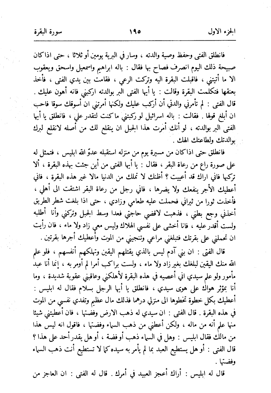 قَالَ الْفَتى: إِن بني آدم لَيْسَ بِالَّذِي يقتلهُمْ الْيَقِين وتهلكهم أنفسهم فَلَو علم الله مِنْك الْيَقِين لبلغك بِغَيْر زَاد وَلَا مَاء وَلست بِرَاكِب أمرا لم أومر بِهِ إِنَّمَا أَنا عبد مَأْمُور وَلَو علم سَيِّدي أَنِّي عصيته فِي هَذِه الْبَقَرَة لأهلكني وعاقبني عُقُوبَة شَدِيدَة وَمَا أَنا بمؤثر هَوَاك على هوى سَيِّدي فَانْطَلق يَا أَيهَا الرجل بِسَلام فَقَالَ لَهُ إِبْلِيس: أُعْطِيك بِكُل خطْوَة تخطوها إِلَى منزلي درهما فَذَلِك مَال عَظِيم وتفدي نَفسِي من الْمَوْت فِي هَذِه الْبَقَرَة