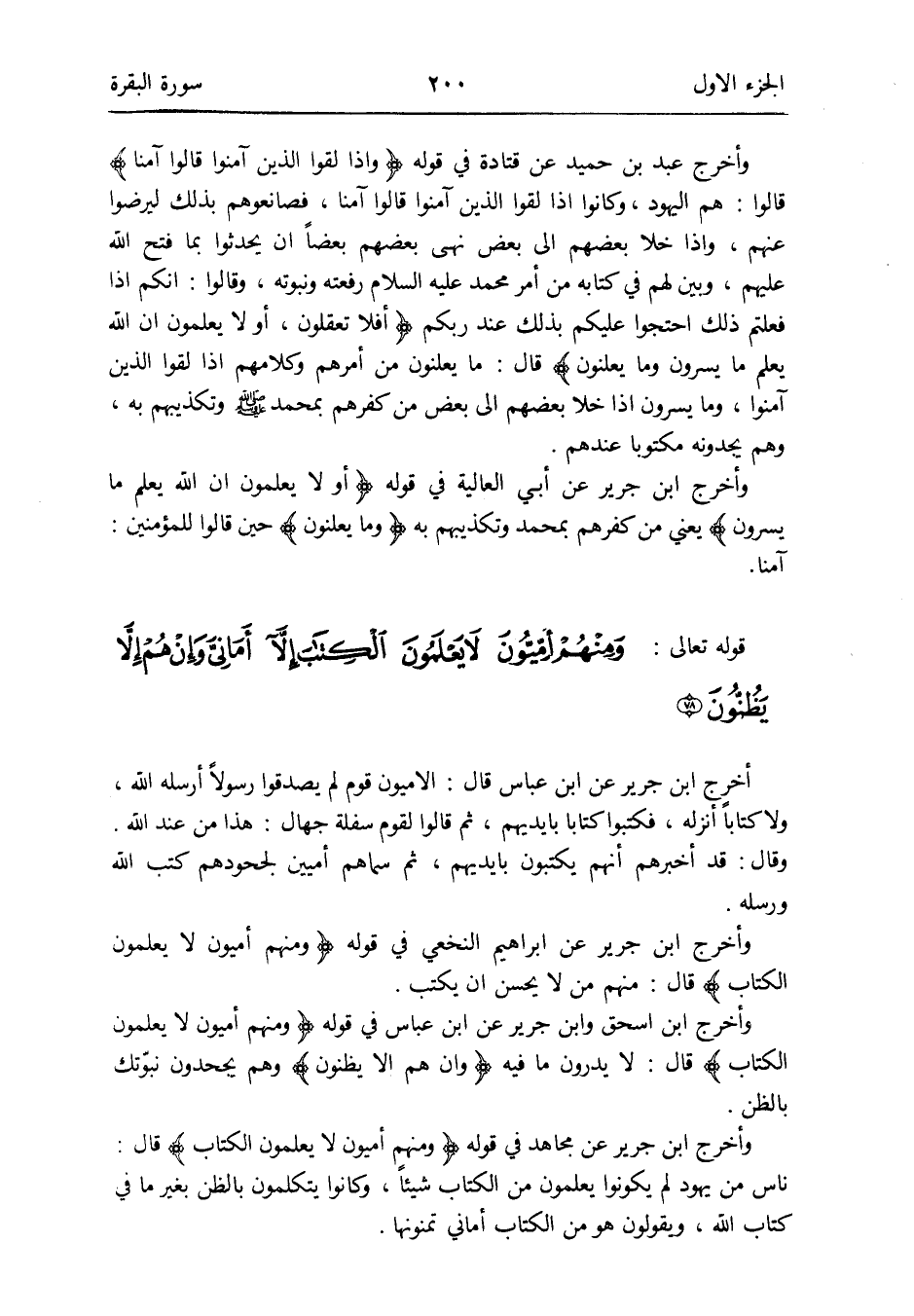 وَأخرج ابْن جرير عَن مُجَاهِد فِي قَوْله {وَمِنْهُم أُمِّيُّونَ لَا يعلمُونَ الْكتاب} قَالَ: نَاس من يهود لم يَكُونُوا يعلمُونَ من الْكتاب شَيْئا وَكَانُوا يَتَكَلَّمُونَ بِالظَّنِّ بِغَيْر مَا فِي كتاب الله ويقولن هُوَ من الْكتاب أماني تمنونها