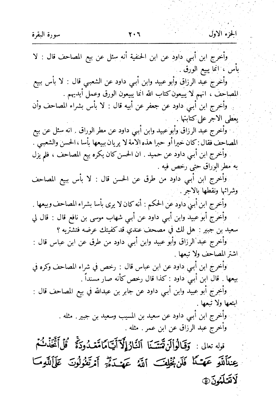 وَأخرج أَبُو عبيد وَابْن أبي دَاوُد عَن أبي شهَاب مُوسَى بن نَافِع قَالَ: قَالَ لي سعيد بن جُبَير: هَل لَك فِي مصحف عِنْدِي قد كفيتك عرضه فتشتريه وَأخرج عبد الرَّزَّاق وَأَبُو عبيد وَابْن أبي دَاوُد من طرق عَن ابْن عَبَّاس قَالَ: اشْتَرِ الْمَصَاحِف وَلَا تبعها