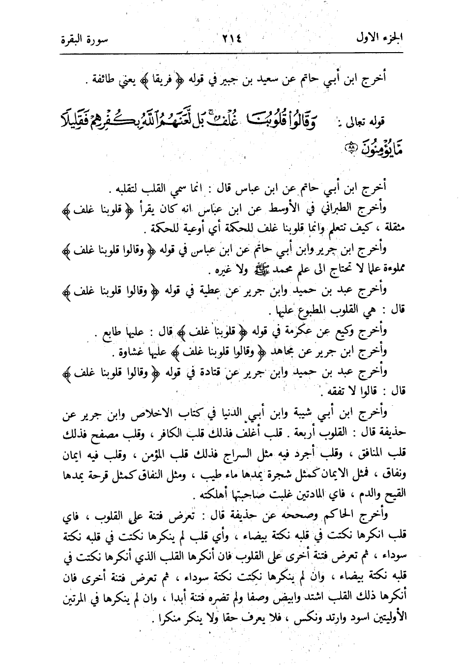 وَأخرج عبد بن حميد وَابْن جرير عَن قَتَادَة فِي قَوْله {وَقَالُوا قُلُوبنَا غلف} قَالَ: قَالُوا لَا تفقه